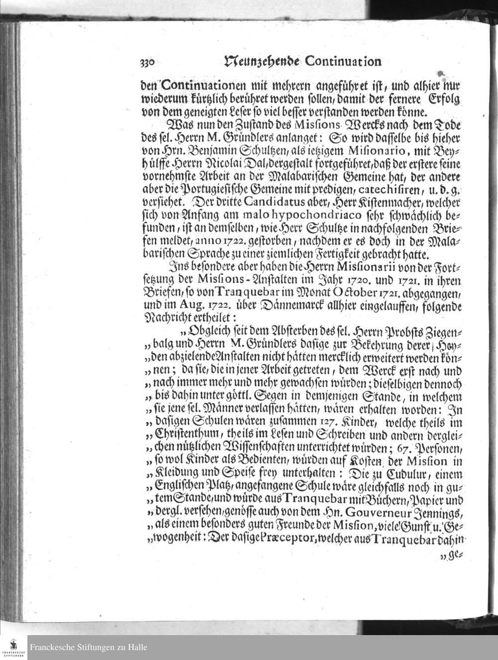 Zwantzigste CONTINUATION des Berichts Derer Koeniglichen Daenischen Missionarien in Ost-Indien/ Worinnen so wol von dem Zustande und Fortsetzung der Mission zu Tranquebar, theils in verschiedenen Bri