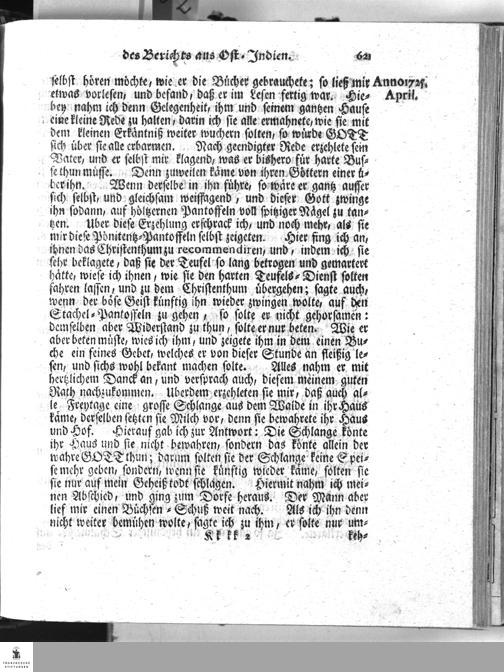 [Des Herrn Missionarii Schultzen Diarium oder] Tage-Register [von den merckwuerdigen Begebenheiten/ so bey dem Missions-Werck zu Tranquebar anno 1725. vorgefallen,]