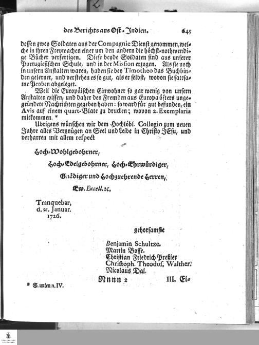 Des Herrn Missionarii Schultzen Schreiben an das hochloebl. Missions-Collegium zu Copenhagen/ wobey die andere Haelfte des vorhergehenden Diarii vom Jul. bis Dec. ueberschicket worden.