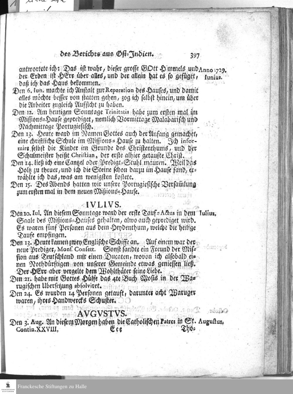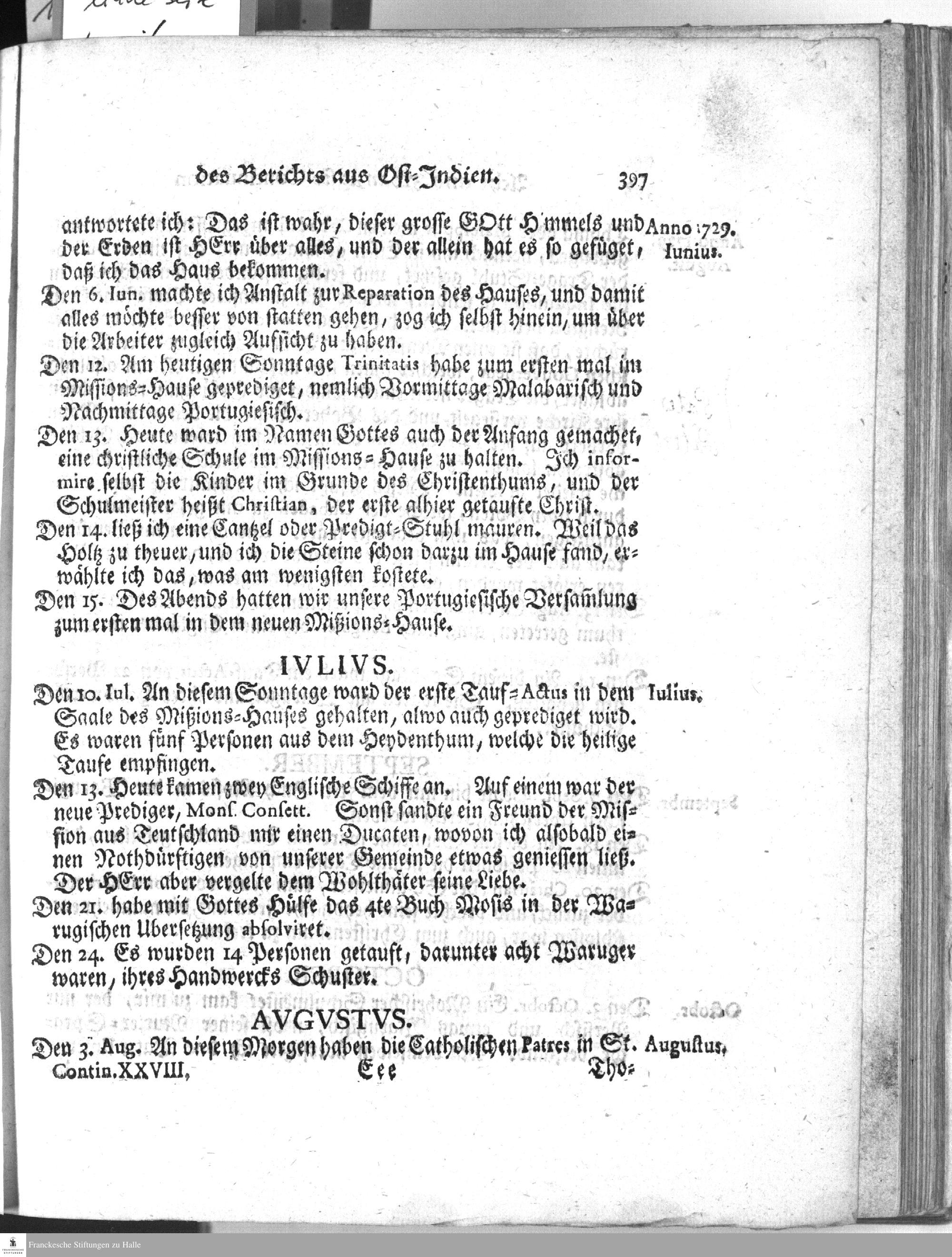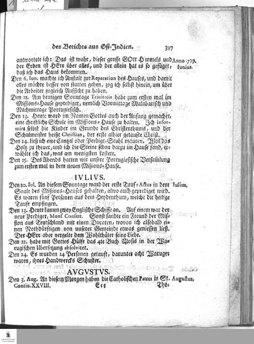 Anhang eines kurtzen Diarii des Herrn Missionarii Schultzen / worin von dem Zustande der neuen Mission in Madras, und von dem / was dabey im Jahr 1729 merckwuerdiges vorgefallen / Nachricht gegeben wird.
