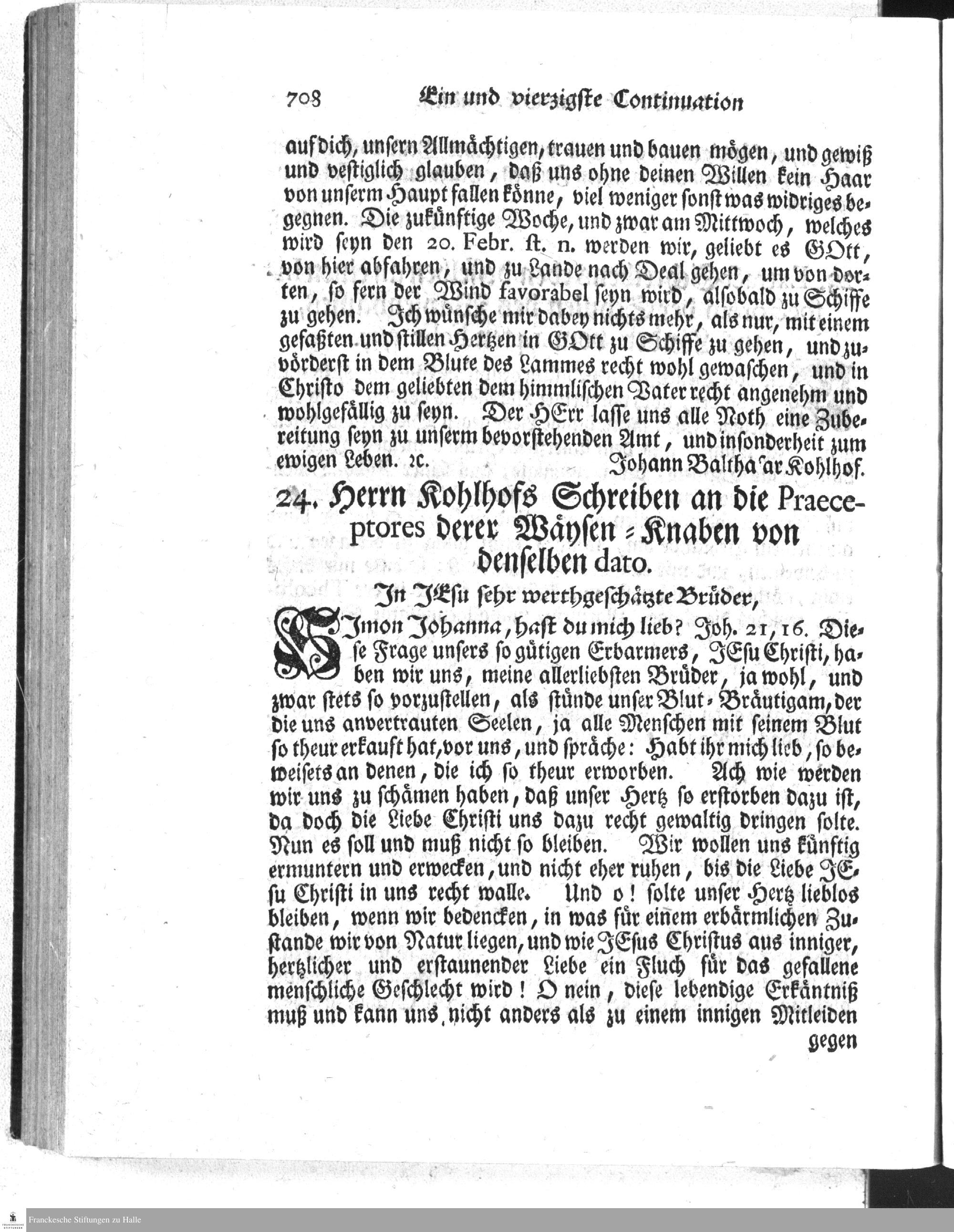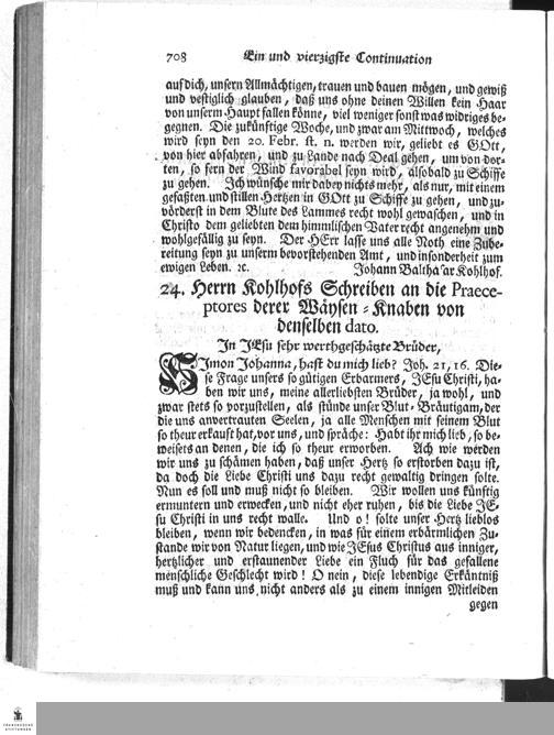 Herrn Kohlhofs Schreiben an die Praeceptores derer Waysen-Knaben.