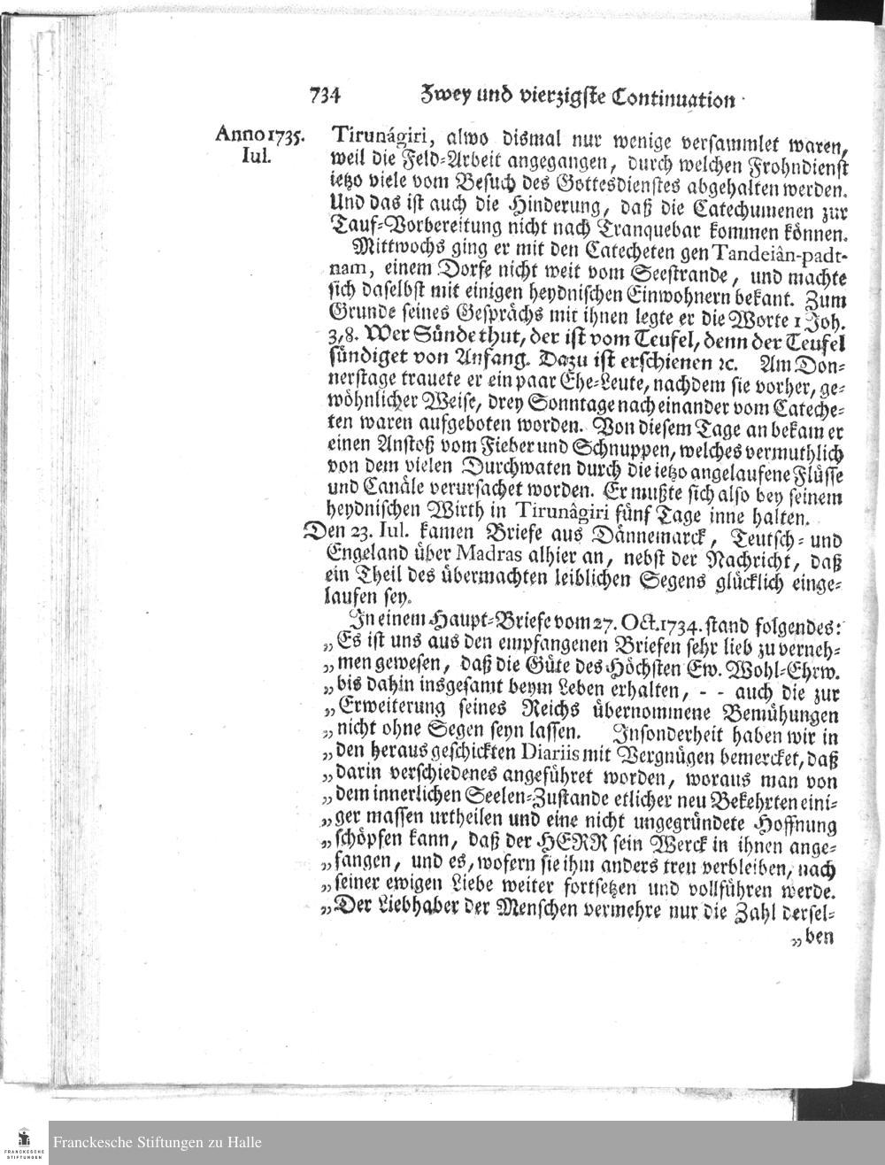 Der Hnn. Missionarien zu Tranquebar Tage-Register von der andern Haelfte des 1735sten Jahres.