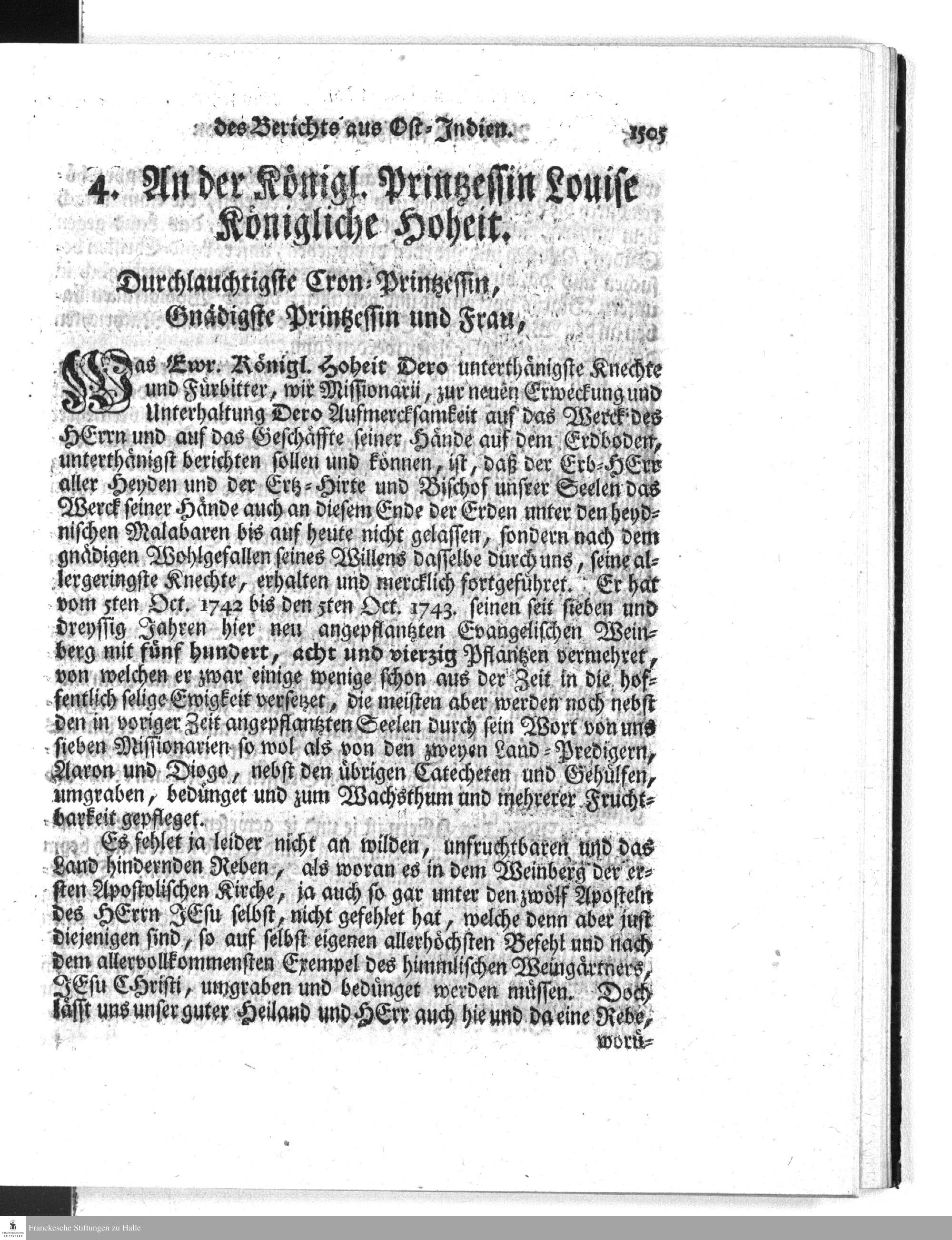 Der Missionarien zu Tranckenbar allerunterthaenigste Berichte an das Hohe Koenigliche Haus in Daennemarck vom Jahr 1743. 4. An der Koenigl. Prinzessin Louise Koenigliche Hoheit.