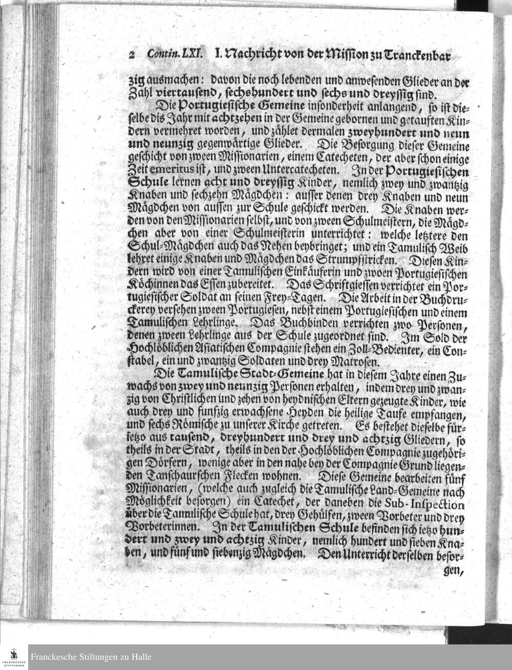 Ein und sechzigste CONTINUATION Des Berichts Der Koenigl. Daenischen Missionarien...