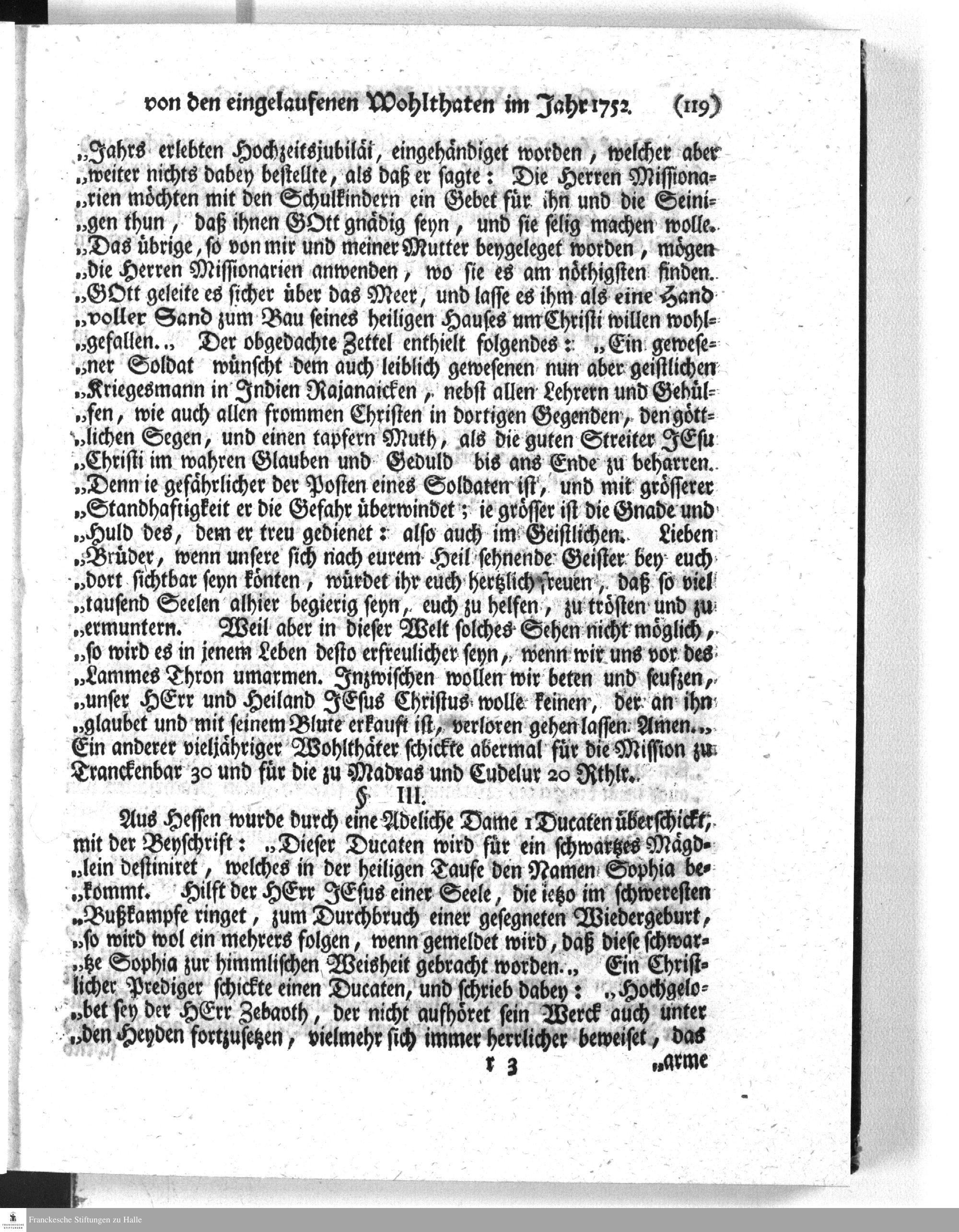 1755: Sieben und siebenzigste Continuation Des Berichts Der Koeniglich-Daenischen Missionarien in Ost-Indien, Worinnen Nebst einigen andern Stuecken Das Tage-Register von der ersten Haelfte des 1752sten Jahres mit einem Anhange Von der Englischen Mission zu Madras in eben demselben Jahre, enthalten; herausgegeben von D. Gotthilf August Francken, Seniore der Theol. Fac. Inspect. im Saal-Creise und Pred. zur L. Fr. HALLE, in Verlegung des Waysenhauses, MDCCLV.