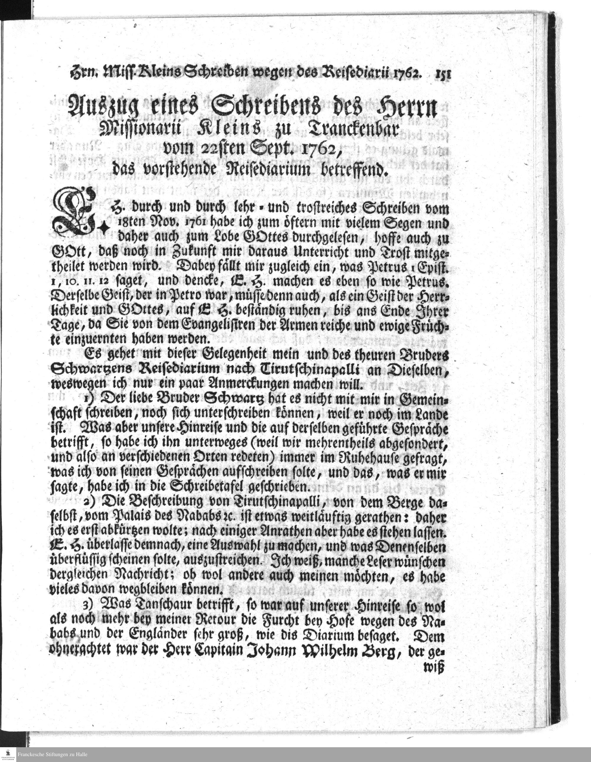 Auszug eines Schreibens des Herrn Missionarii Kleins zu Tranckenbar [...], das vorstehende Reisediarium betreffend.