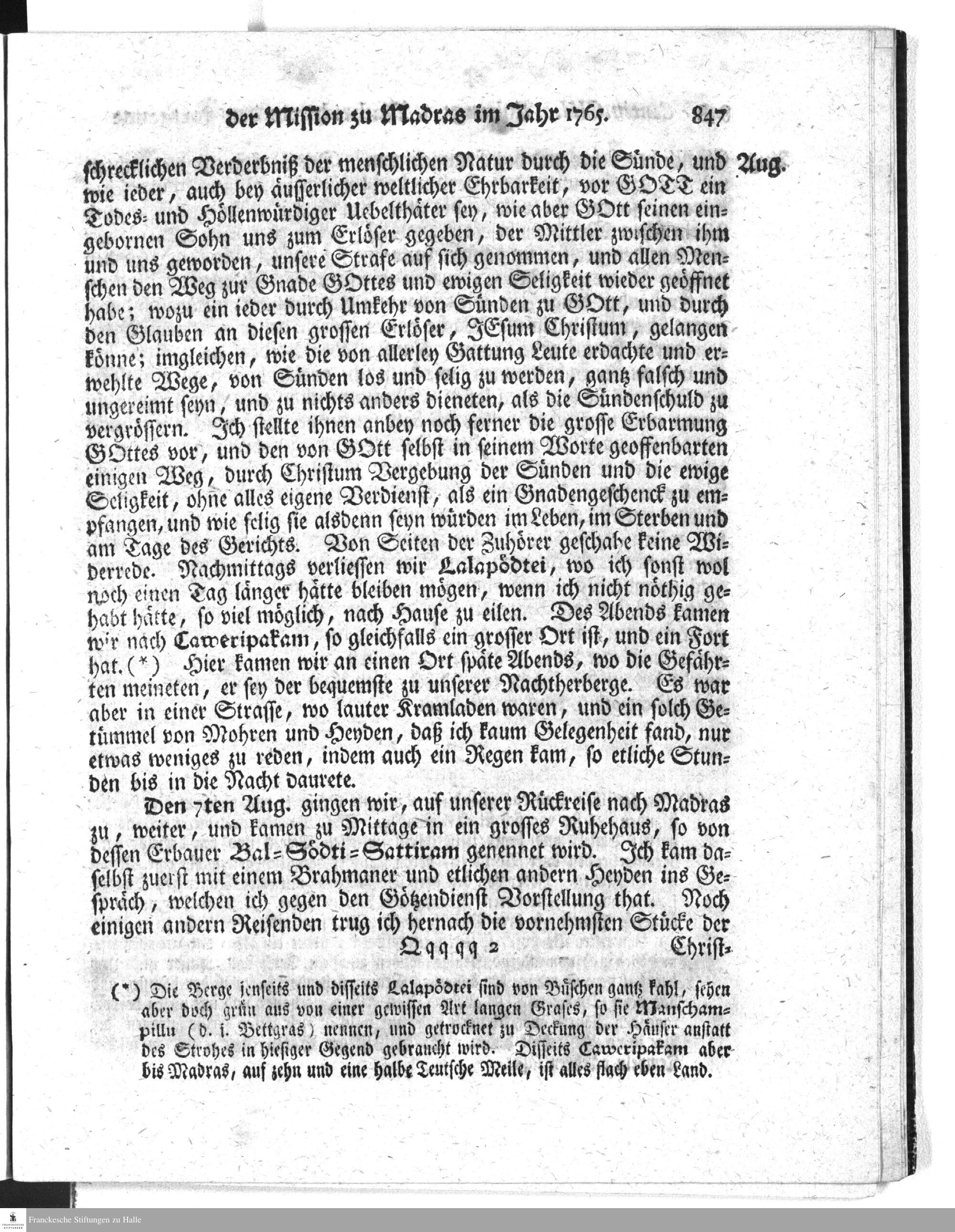 Der beyden Missionarien, Herrn Fabricii und Herrn Breithaupts, Nachricht von dem Fortgange der evangelischen Mission zu Madras im Jahr 1765.