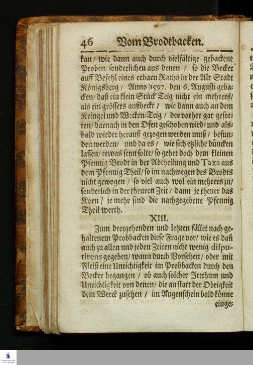 Bericht Vom Brodt-Backen/ Fundiret und gerichtet auff die Substantz/ Natur/ Eigenschafft und Gütigkeit des Fruchtwachs/ und dann nach Art treulichen/ fleißigen vollnständigen mahlens/ sichtens einteigens/ säurens und backens : Dem gemeinem Vaterland/ gemeiner Wolfart/ und lieben Armuth zu sonderm Nutz und Frommen in Druck gegeben: Allen Proviantmeistern/ Verwaltern/ Haußhaltern und Haußvätern sehr nützlich und vorträglich zu wissen / Gestellet durch Sebaldum Müllern/ Bürgern zu Königsberg in Preussen