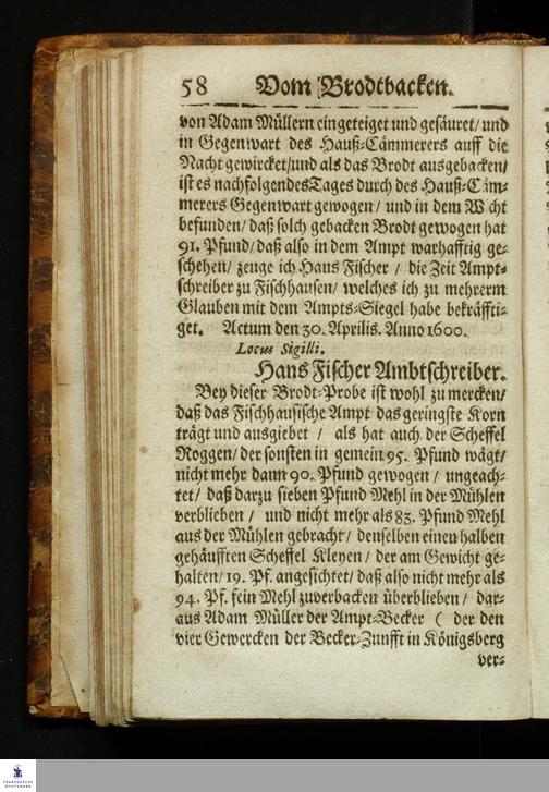 Bericht Vom Brodt-Backen/ Fundiret und gerichtet auff die Substantz/ Natur/ Eigenschafft und Gütigkeit des Fruchtwachs/ und dann nach Art treulichen/ fleißigen vollnständigen mahlens/ sichtens einteigens/ säurens und backens : Dem gemeinem Vaterland/ gemeiner Wolfart/ und lieben Armuth zu sonderm Nutz und Frommen in Druck gegeben: Allen Proviantmeistern/ Verwaltern/ Haußhaltern und Haußvätern sehr nützlich und vorträglich zu wissen / Gestellet durch Sebaldum Müllern/ Bürgern zu Königsberg in Preussen