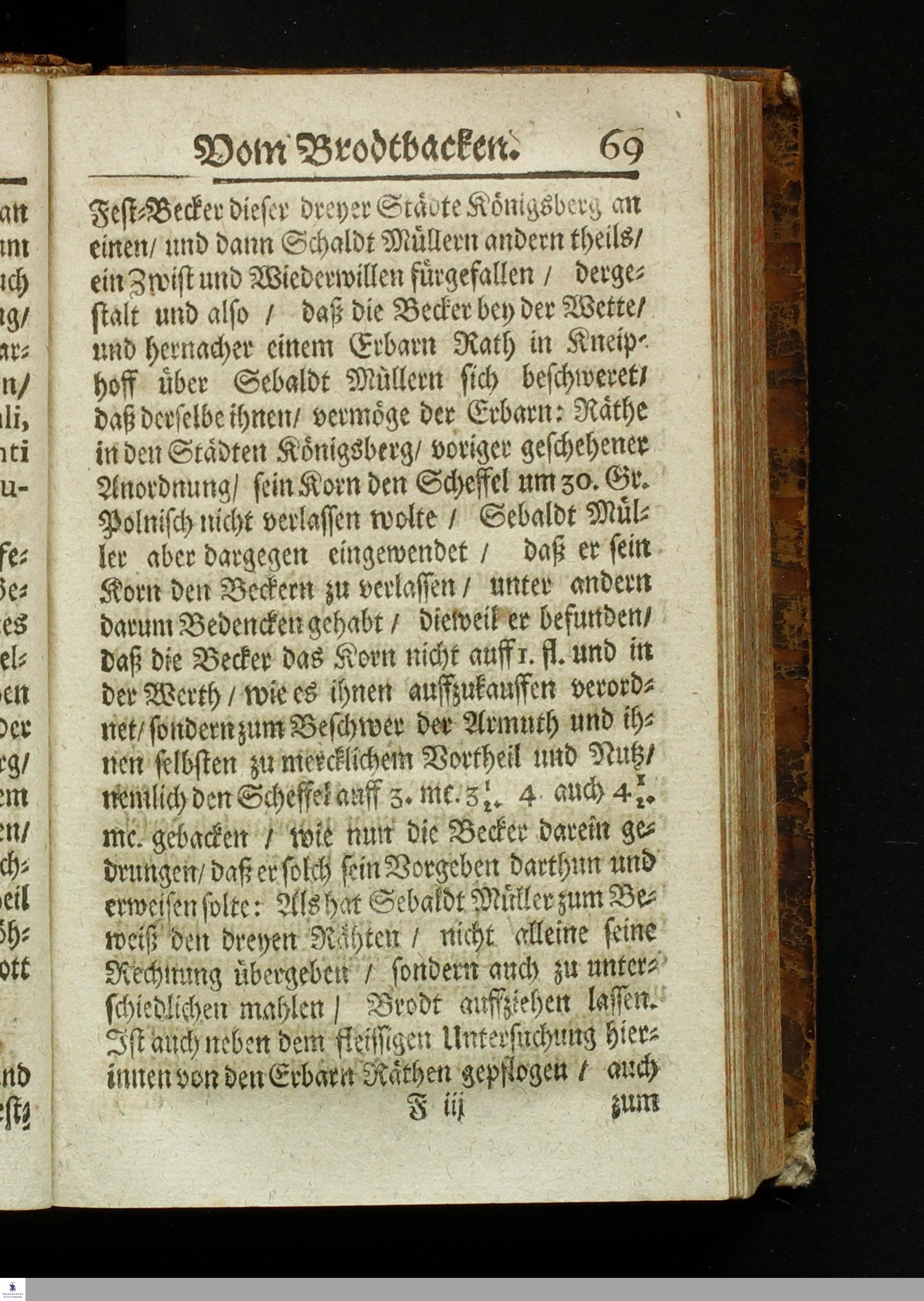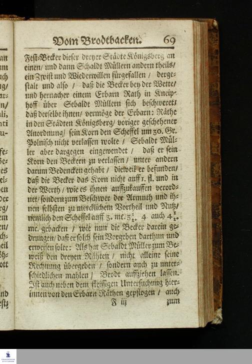 Bericht Vom Brodt-Backen/ Fundiret und gerichtet auff die Substantz/ Natur/ Eigenschafft und Gütigkeit des Fruchtwachs/ und dann nach Art treulichen/ fleißigen vollnständigen mahlens/ sichtens einteigens/ säurens und backens : Dem gemeinem Vaterland/ gemeiner Wolfart/ und lieben Armuth zu sonderm Nutz und Frommen in Druck gegeben: Allen Proviantmeistern/ Verwaltern/ Haußhaltern und Haußvätern sehr nützlich und vorträglich zu wissen / Gestellet durch Sebaldum Müllern/ Bürgern zu Königsberg in Preussen