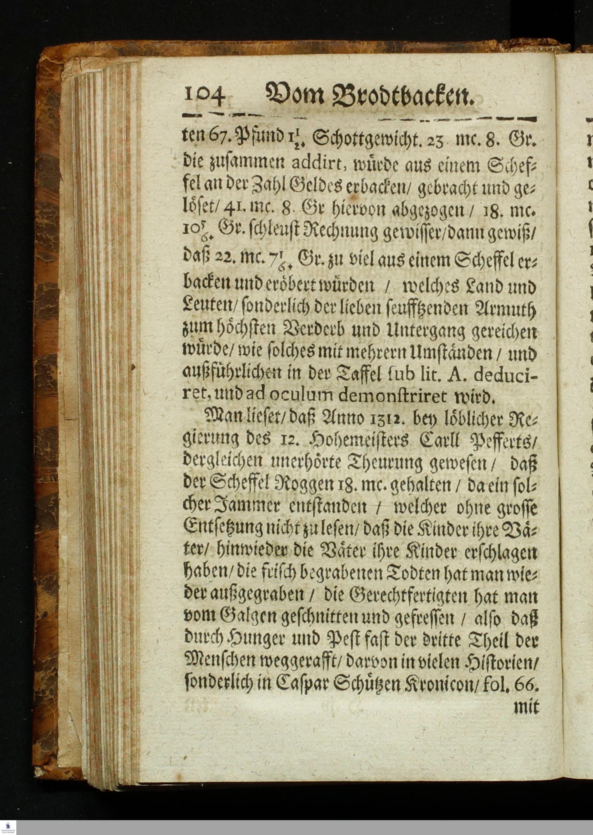 Bericht Vom Brodt-Backen/ Fundiret und gerichtet auff die Substantz/ Natur/ Eigenschafft und Gütigkeit des Fruchtwachs/ und dann nach Art treulichen/ fleißigen vollnständigen mahlens/ sichtens einteigens/ säurens und backens : Dem gemeinem Vaterland/ gemeiner Wolfart/ und lieben Armuth zu sonderm Nutz und Frommen in Druck gegeben: Allen Proviantmeistern/ Verwaltern/ Haußhaltern und Haußvätern sehr nützlich und vorträglich zu wissen / Gestellet durch Sebaldum Müllern/ Bürgern zu Königsberg in Preussen