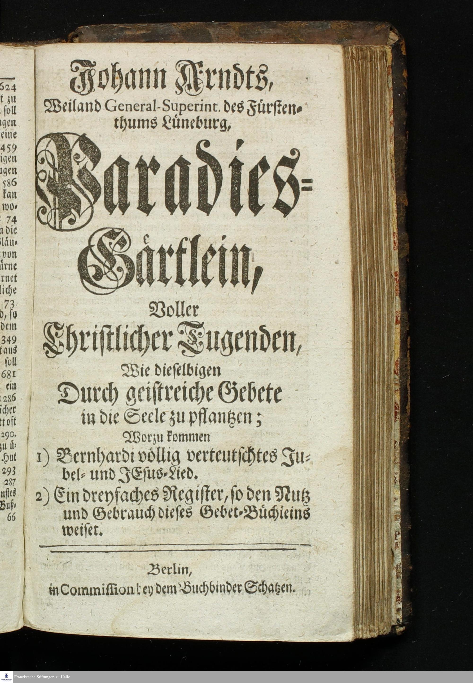 Des Hocherleuchteten Herrn Johann Arnds, Weiland General-Superintendentens des Fürstenthums Lüneburg Sechs Bücher Vom Wahren Christenthum : Das ist: Von der wahren Bekehrung, vom lebendigen Glauben und heiligem Leben rechtschaffener Christen : Nebst Beygefügtem Lebenslauf, Informatorio, Biblico, Gebetern, gewöhnlichen Anhängen und Registern, auch accuraten Summarien,