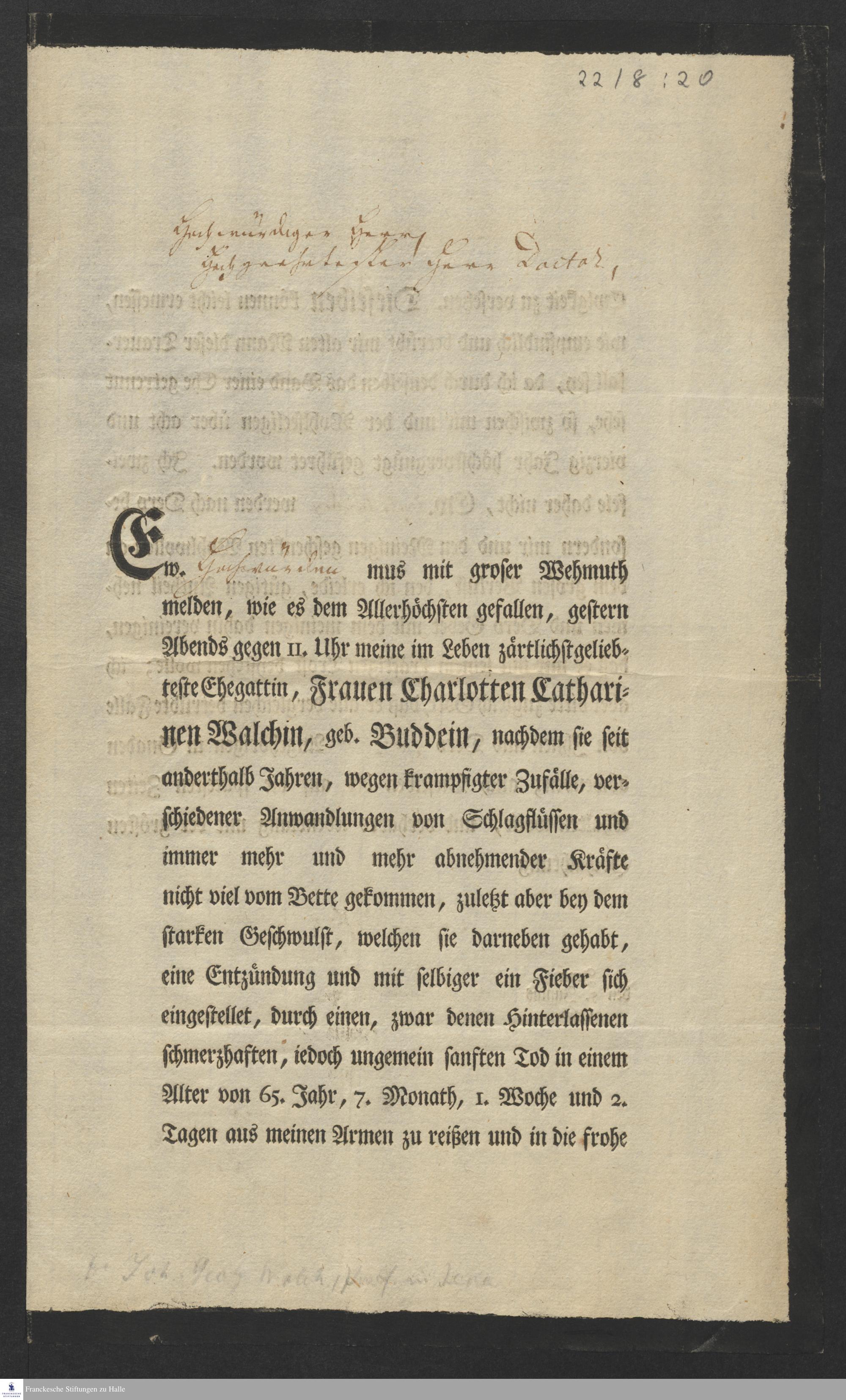Brief von Johann Georg Walch an Gotthilf August Francke.