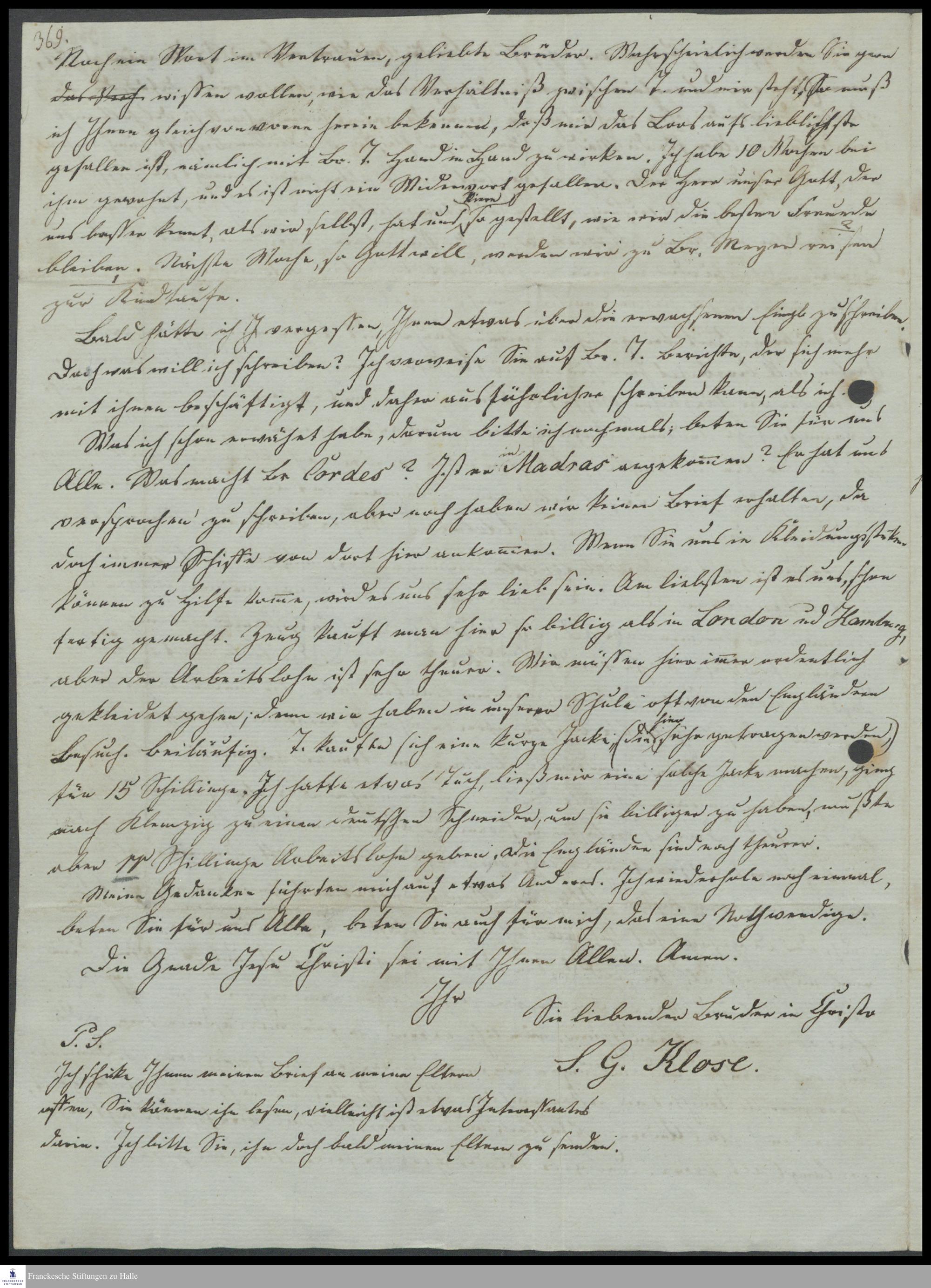 Brief von Samuel Gottlieb Klose an das Komitee der ev.-luth. Missionsgesellschaft Dresden.
