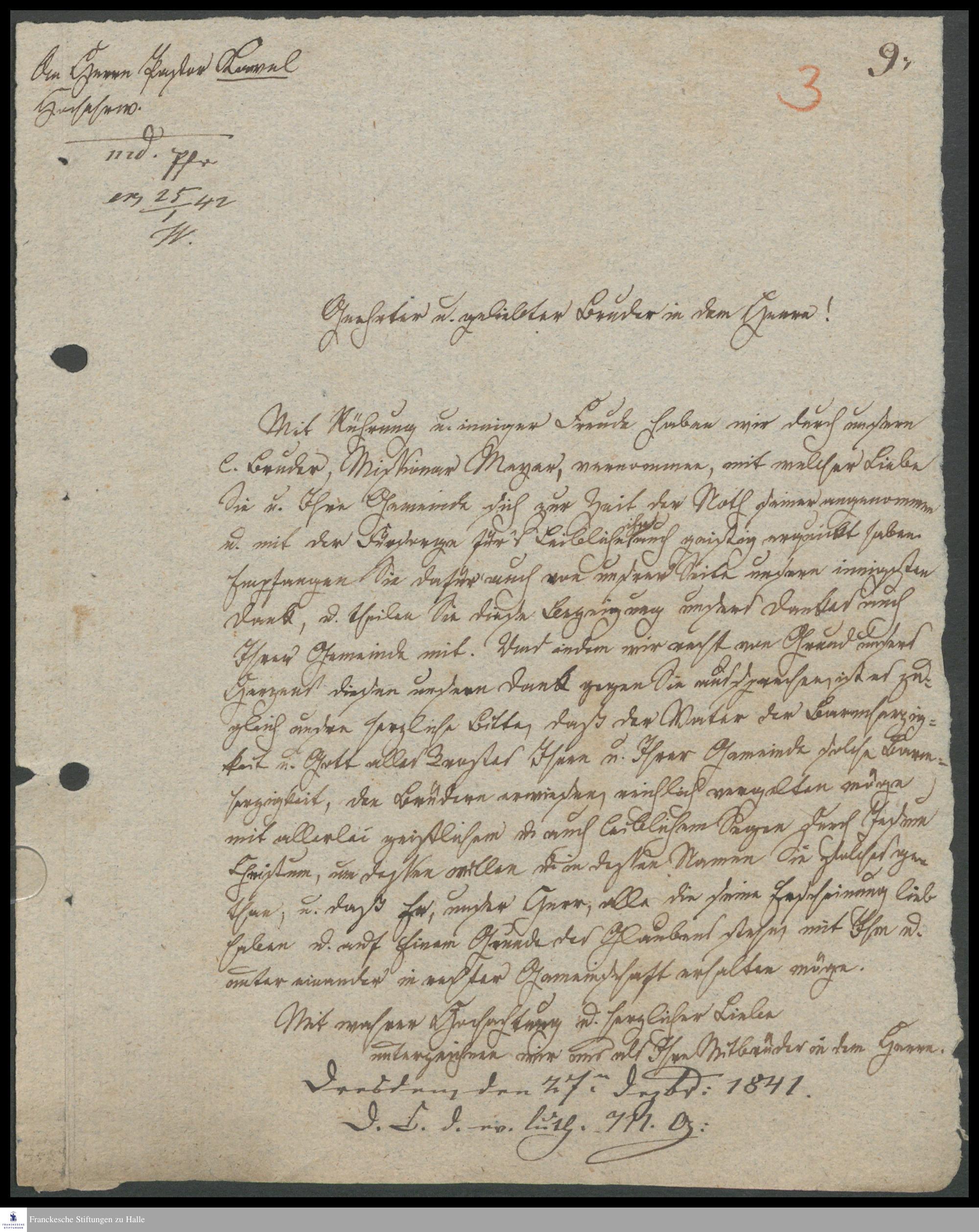 Brief des Komitees der ev.-luth. Missionsgesellschaft Dresden an August Ludwig Christian Kavel.