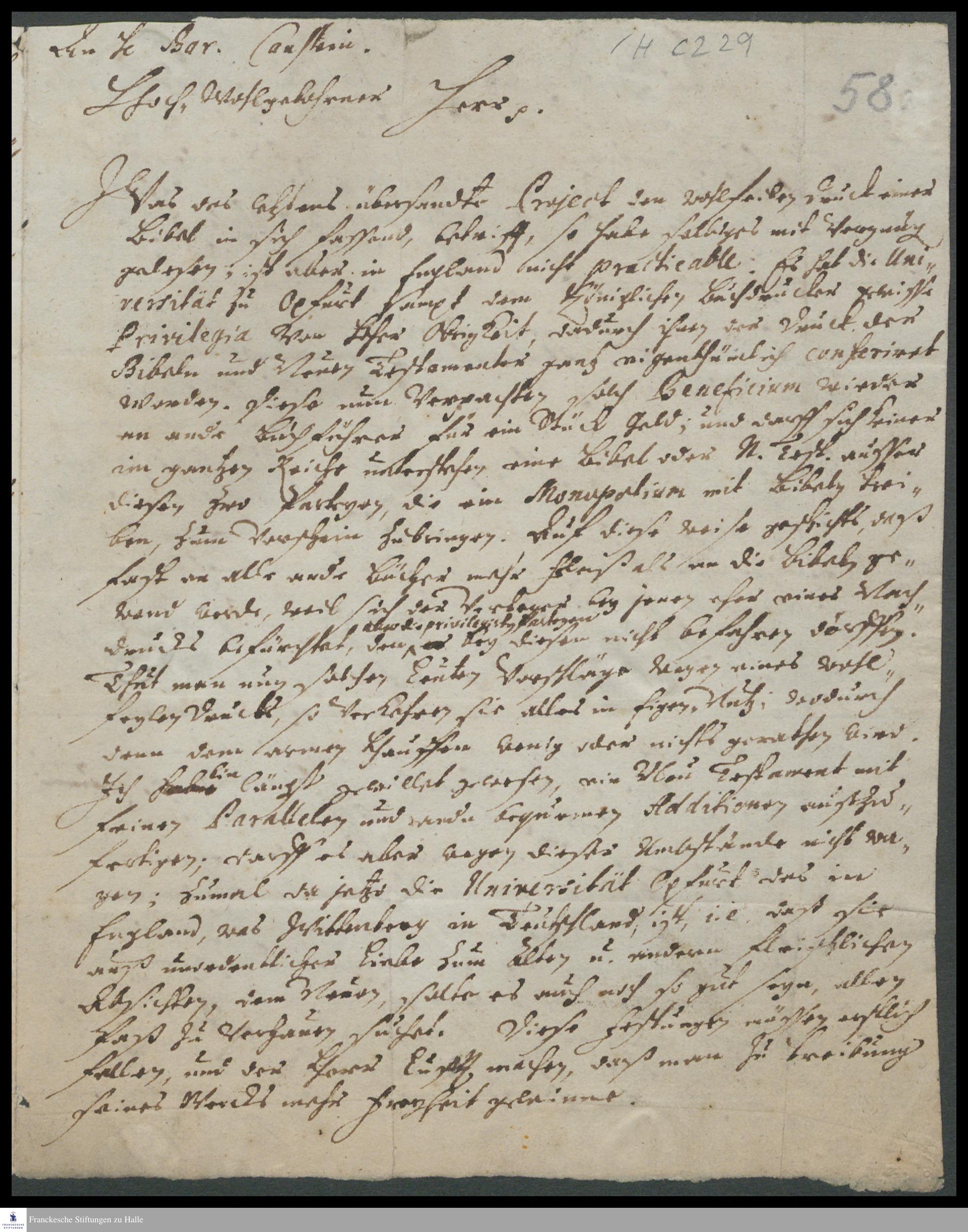 Brief von Anton Wilhelm Böhme an Carl Hildebrand v. Canstein.