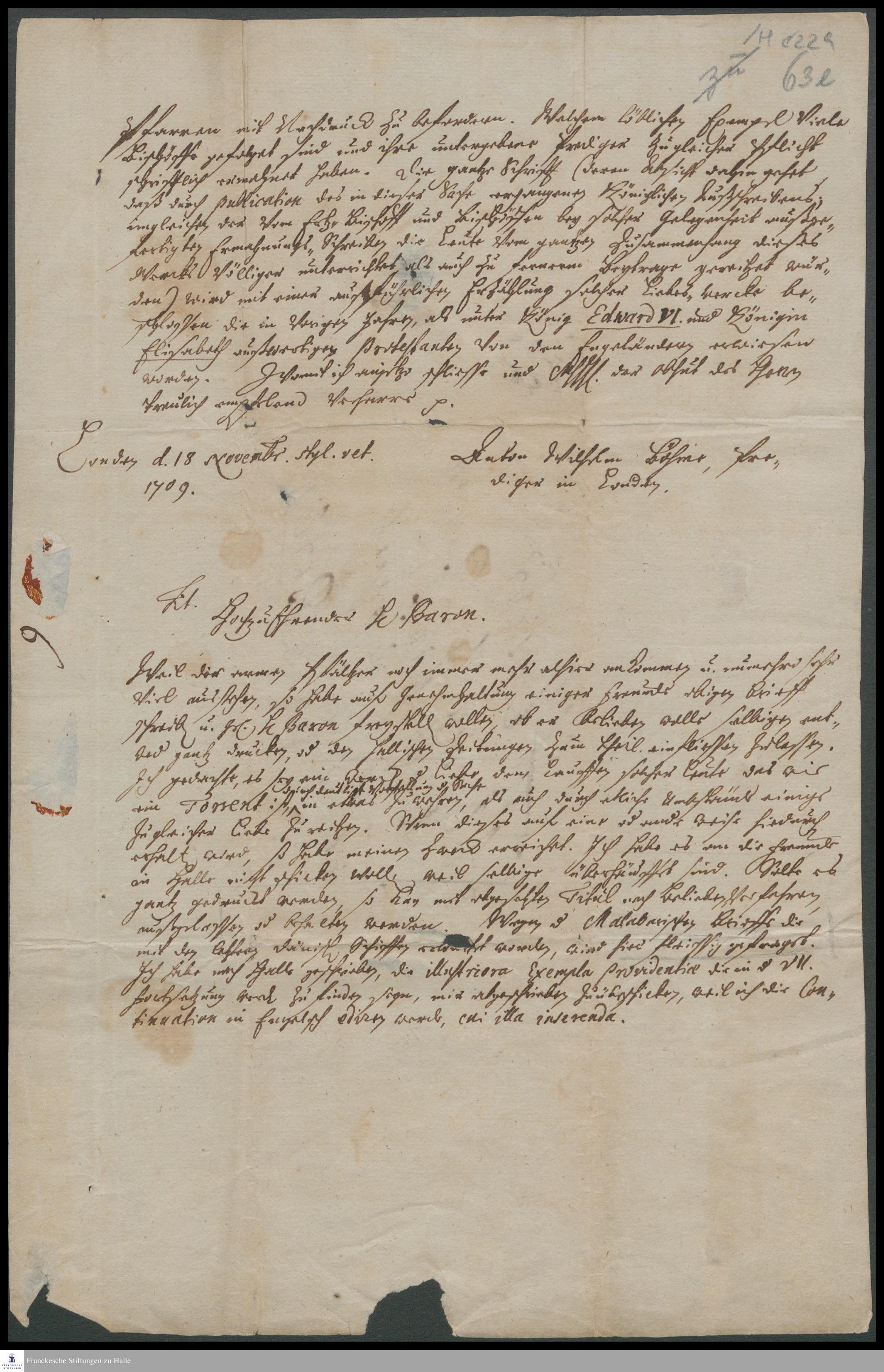 Brief von Anton Wilhelm Böhme an Carl Hildebrand v. Canstein.
