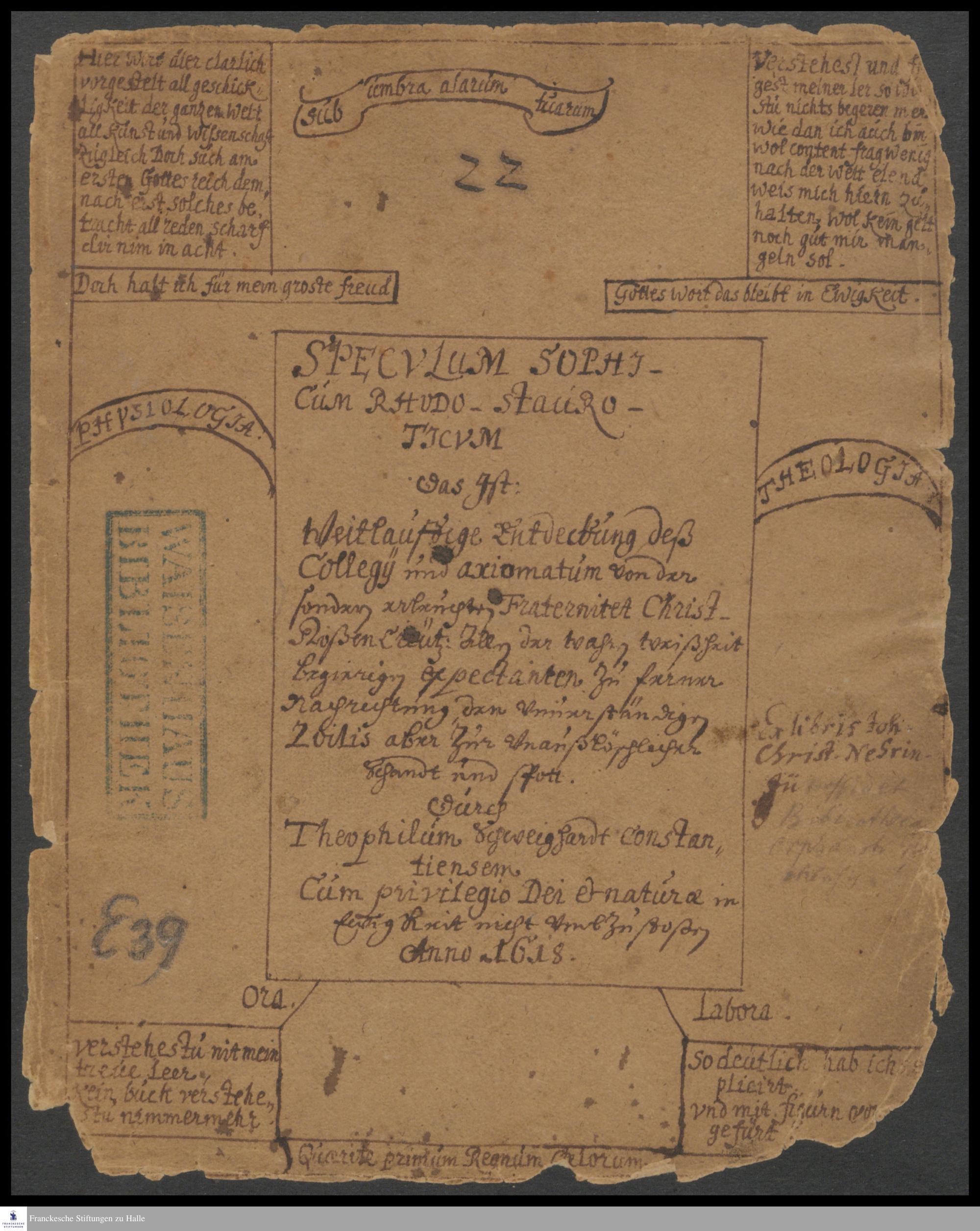 Theophil Schweighardt: Specvlvm Sophicum Rhodo-Stauroticvm Das ist: Weitläuffige Entdeckung deß Collegii und axiomatum von der sondern erleuchten Fraternitet Christ-RoßenCreutz: Allen der wahrn Weißheit begierigen Expectanten zu ferner Nachrichtung, den vnuerständigen Zoilis aber zur vnaußlöschlicher Schandt nnd Spott .