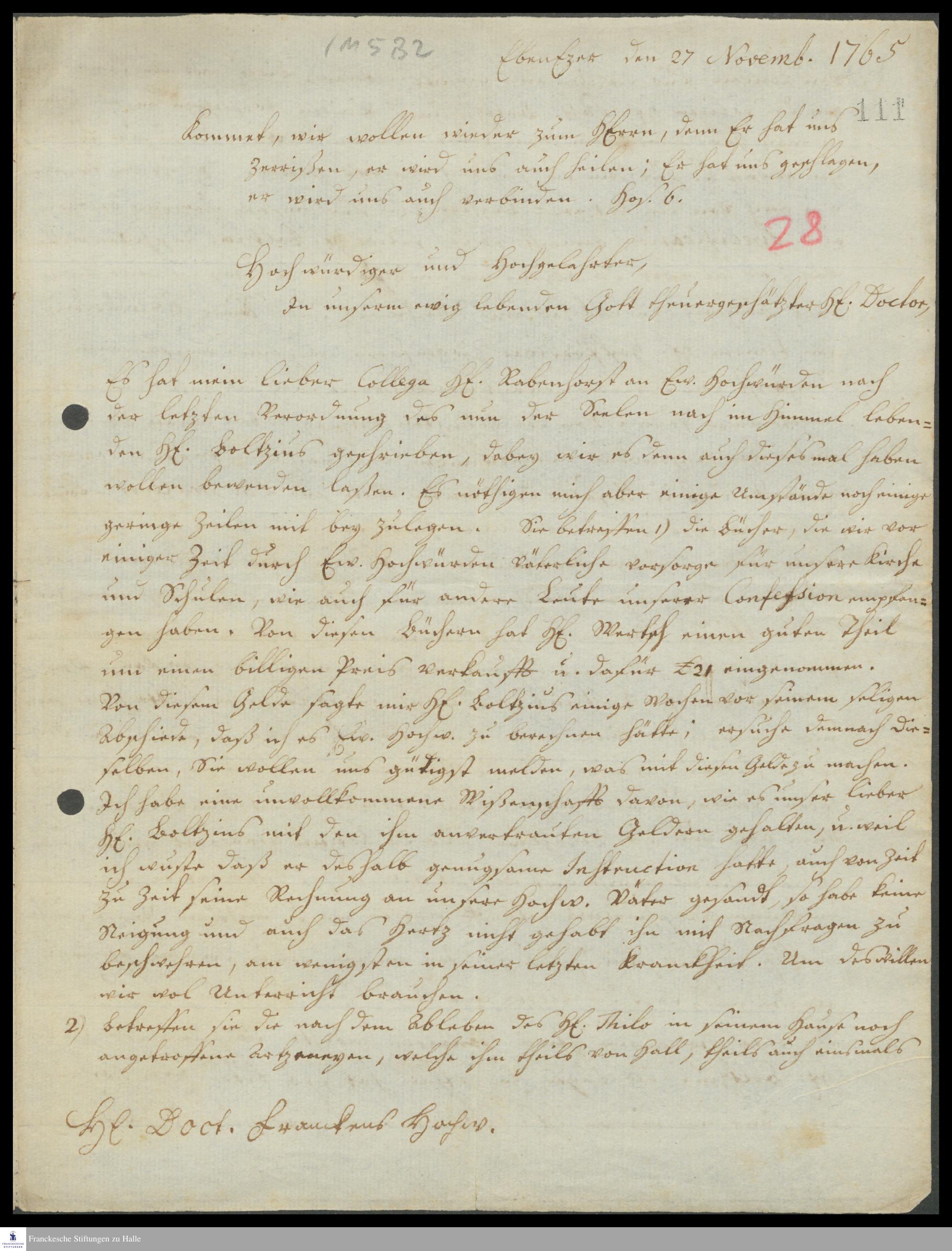 Brief von Hermann Heinrich Lemke an Gotthilf August Francke, in dem er um Anweisungen zum Umgang mit dem für Medikamente und Bücher eingenommenen Geld bittet.
