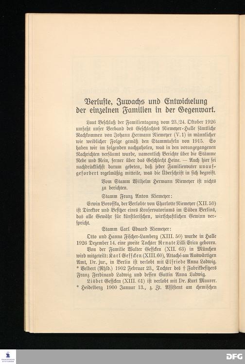 Verlust, Zuwachs und Entwickelung der einzelnen Familien in der Gegenwart.