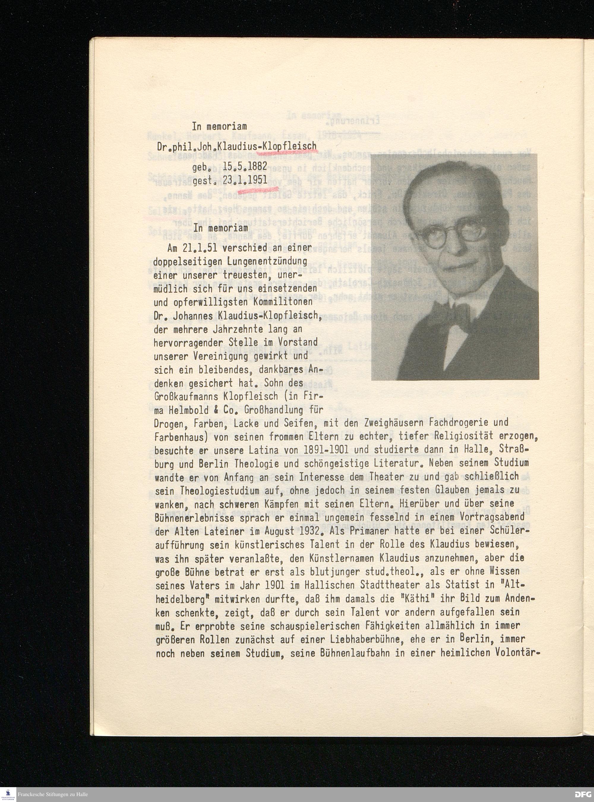 In memoriam Dr. phil. Joh. Klaudius-Klopfleisch