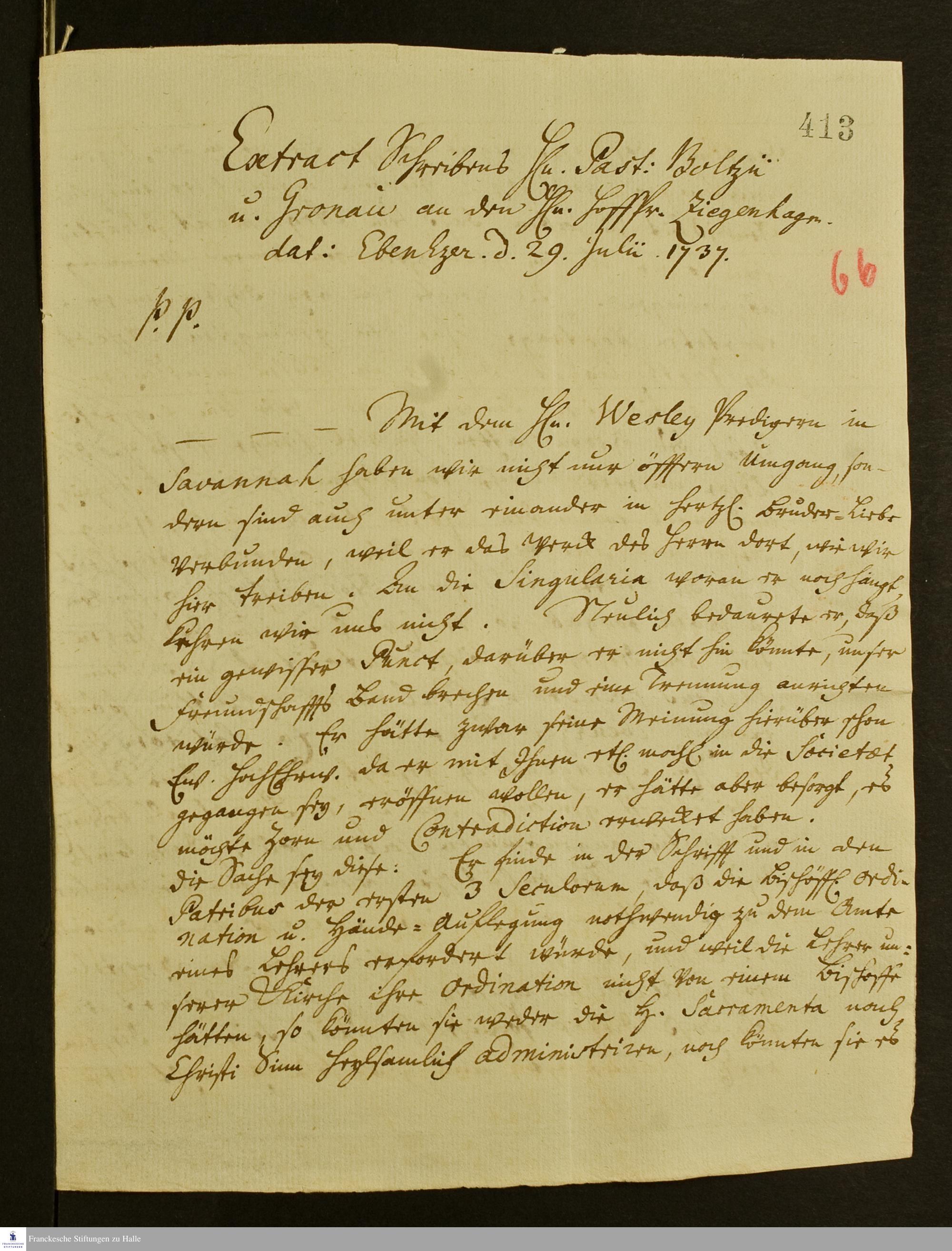 Auszug eines Briefes von Johann Martin Boltzius und Israel Christian Gronau an Friedrich Michael Ziegenhagen über John Wesleys Auffassung zur bischöflichen Ordination.