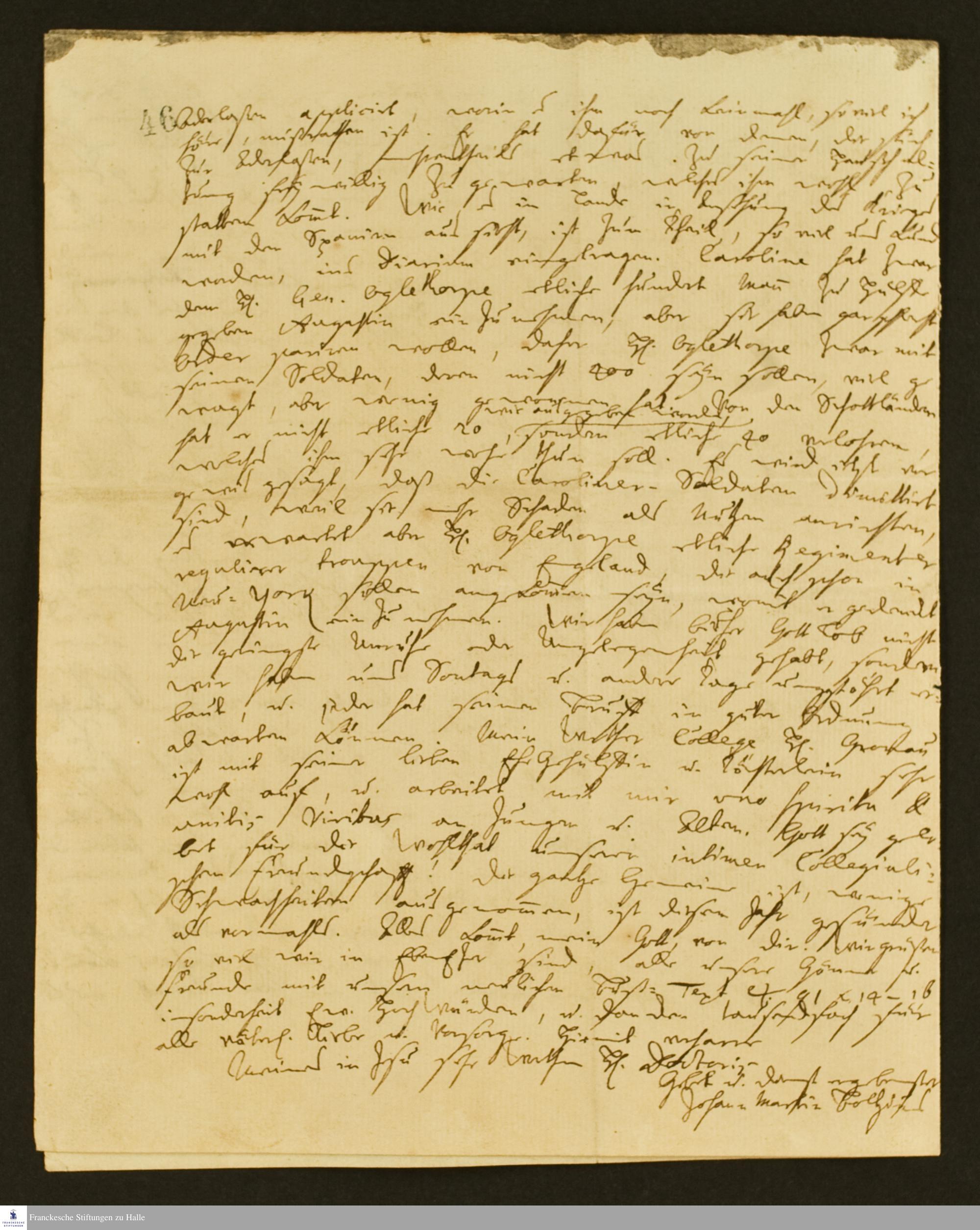 Brief von Johann Martin Boltzius an Gotthilf August Francke über die Dankbarkeit der Kinder für den Erhalt der Warensendung mit Leinen und Medikamenten aus Halle, das gute Verhältnis der Pastoren zu Christian Ernst Thilo sowie einen militärischen Mißerfolg James Edward Oglethorpes.