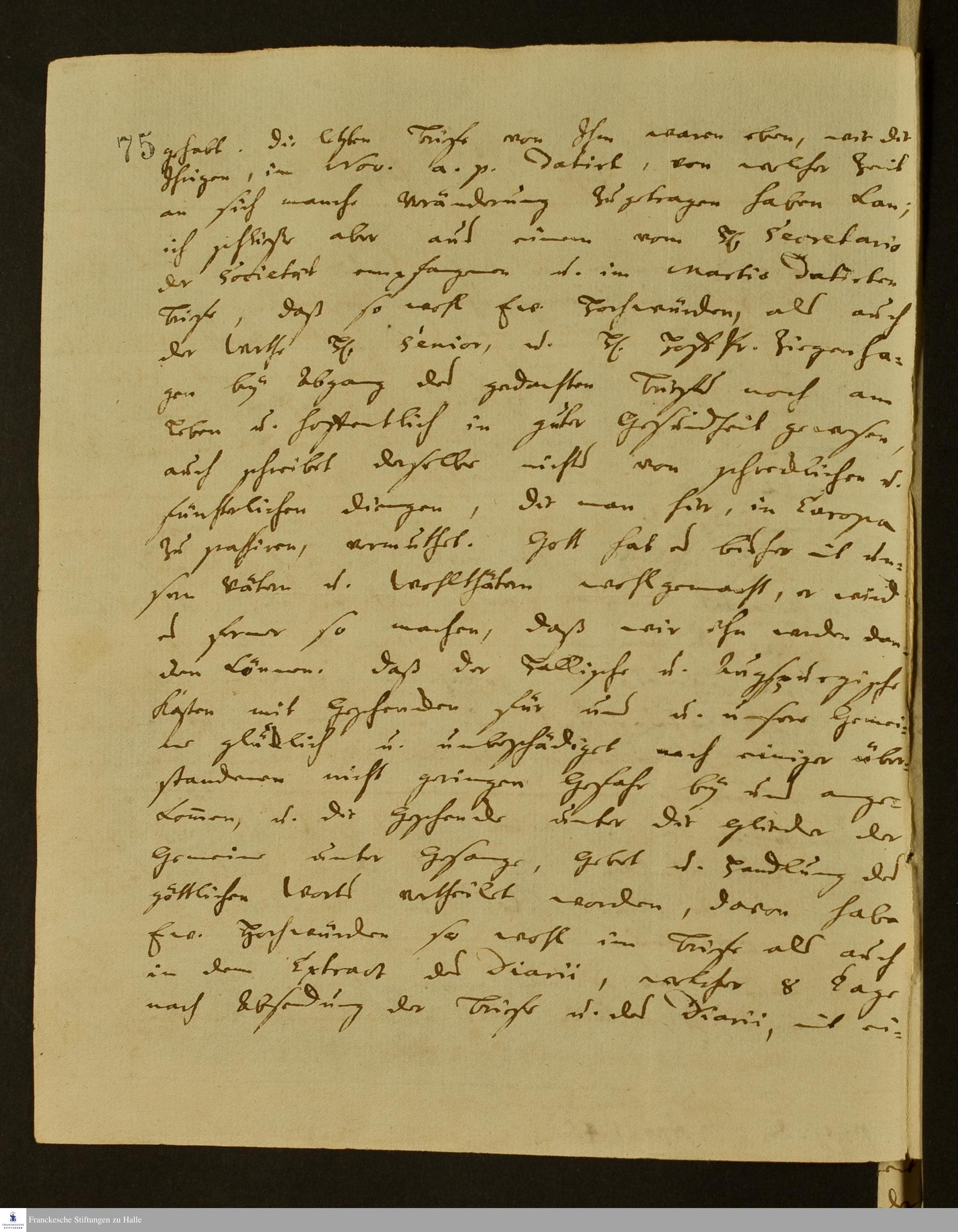 Brief von Johann Martin Boltzius an Gotthilf August Francke über die Auswirkungen des Kolonialkrieges auf Ebenezer, den geplanten Bau einer Sägemühle sowie die Besserung der Gesundheit Israel Christian Gronaus.