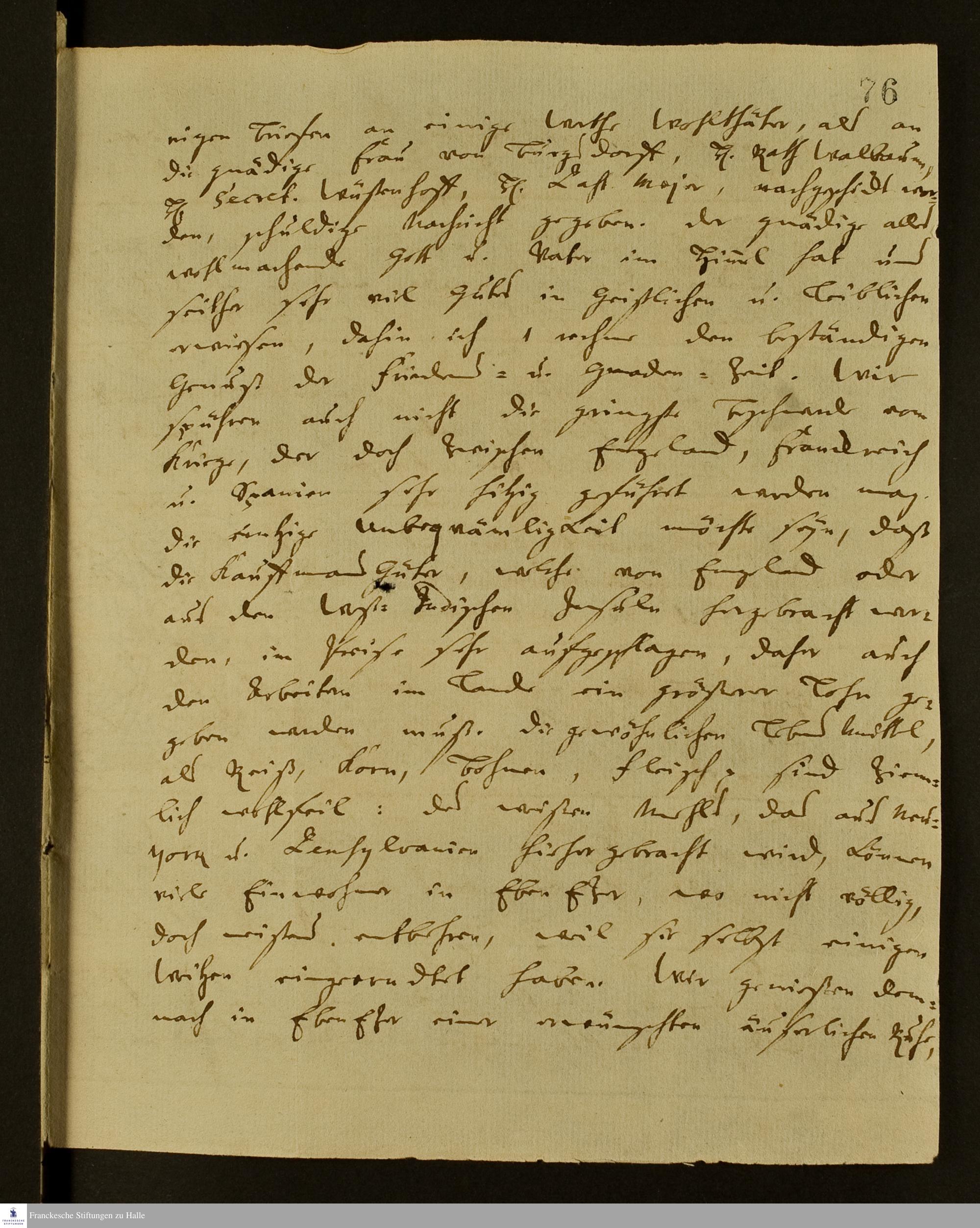 Brief von Johann Martin Boltzius an Gotthilf August Francke über die Auswirkungen des Kolonialkrieges auf Ebenezer, den geplanten Bau einer Sägemühle sowie die Besserung der Gesundheit Israel Christian Gronaus.