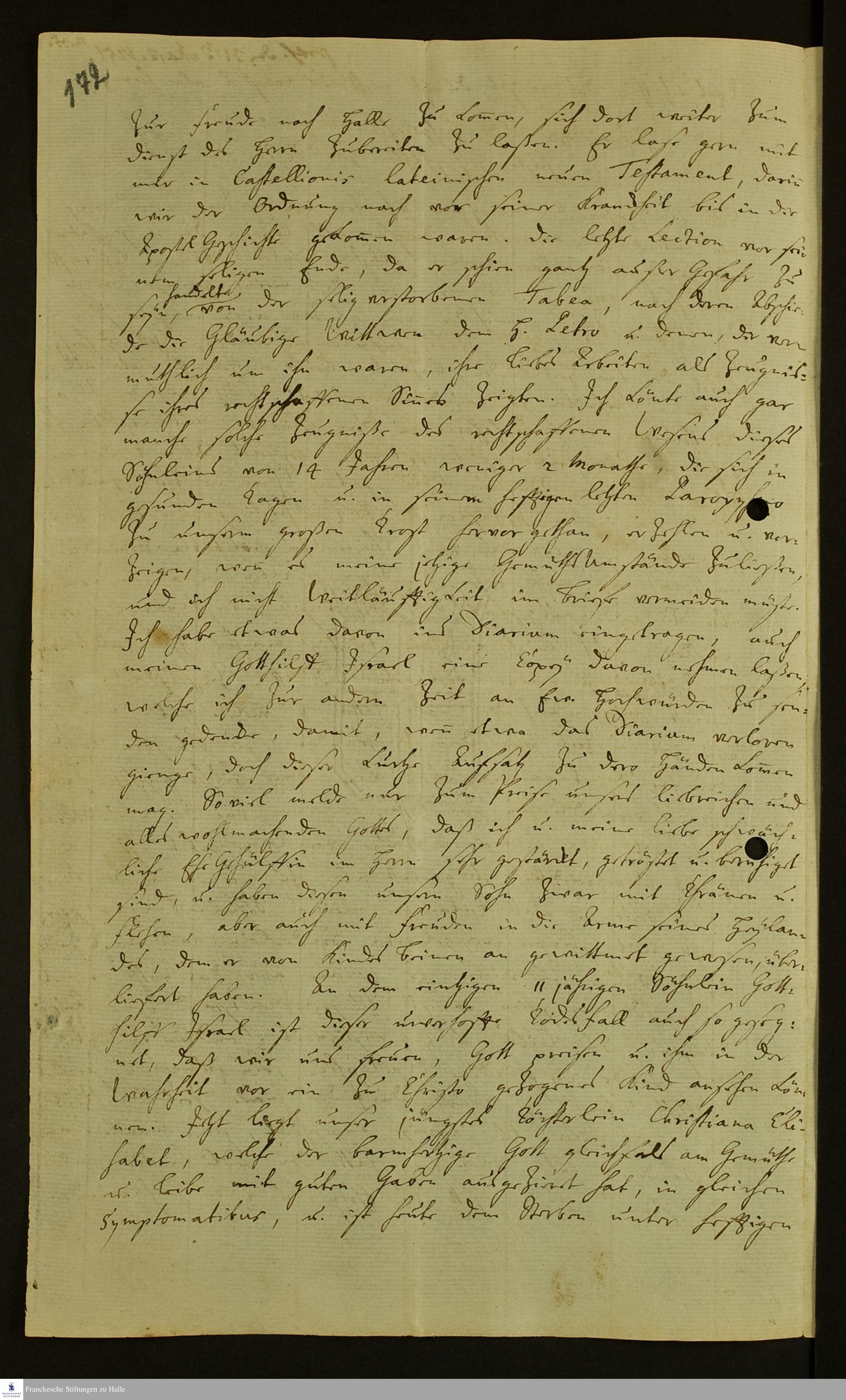 Brief von Johann Martin Boltzius an Gotthilf August Francke über den Tod seines ältesten Sohnes und seiner jüngsten Tochter.