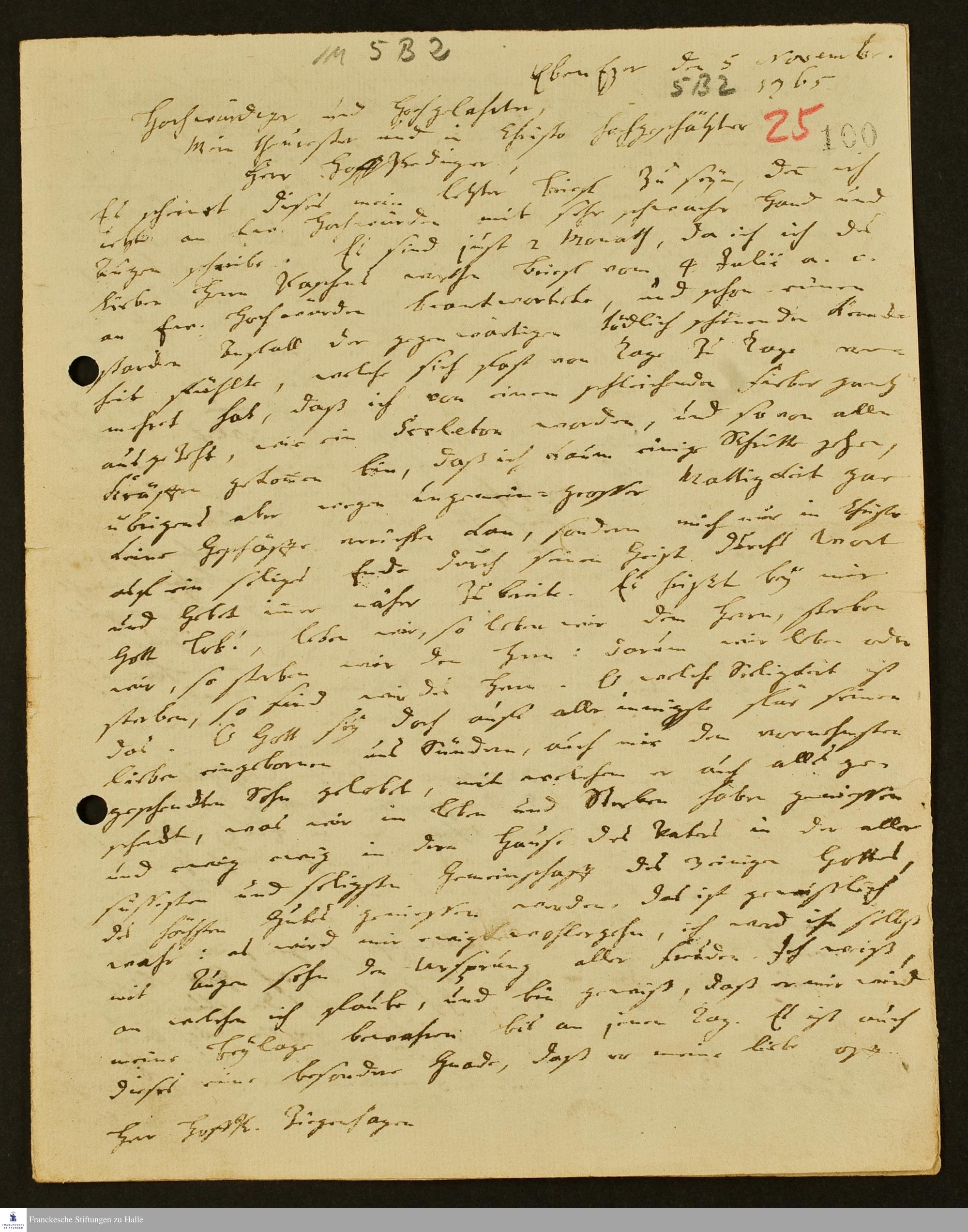 Abschiedsbrief von Johann Martin Boltzius an Friedrich Michael Ziegenhagen, in dem er für alle Wohltaten dankt und einige Nachlaßangelegenheiten erwähnt.