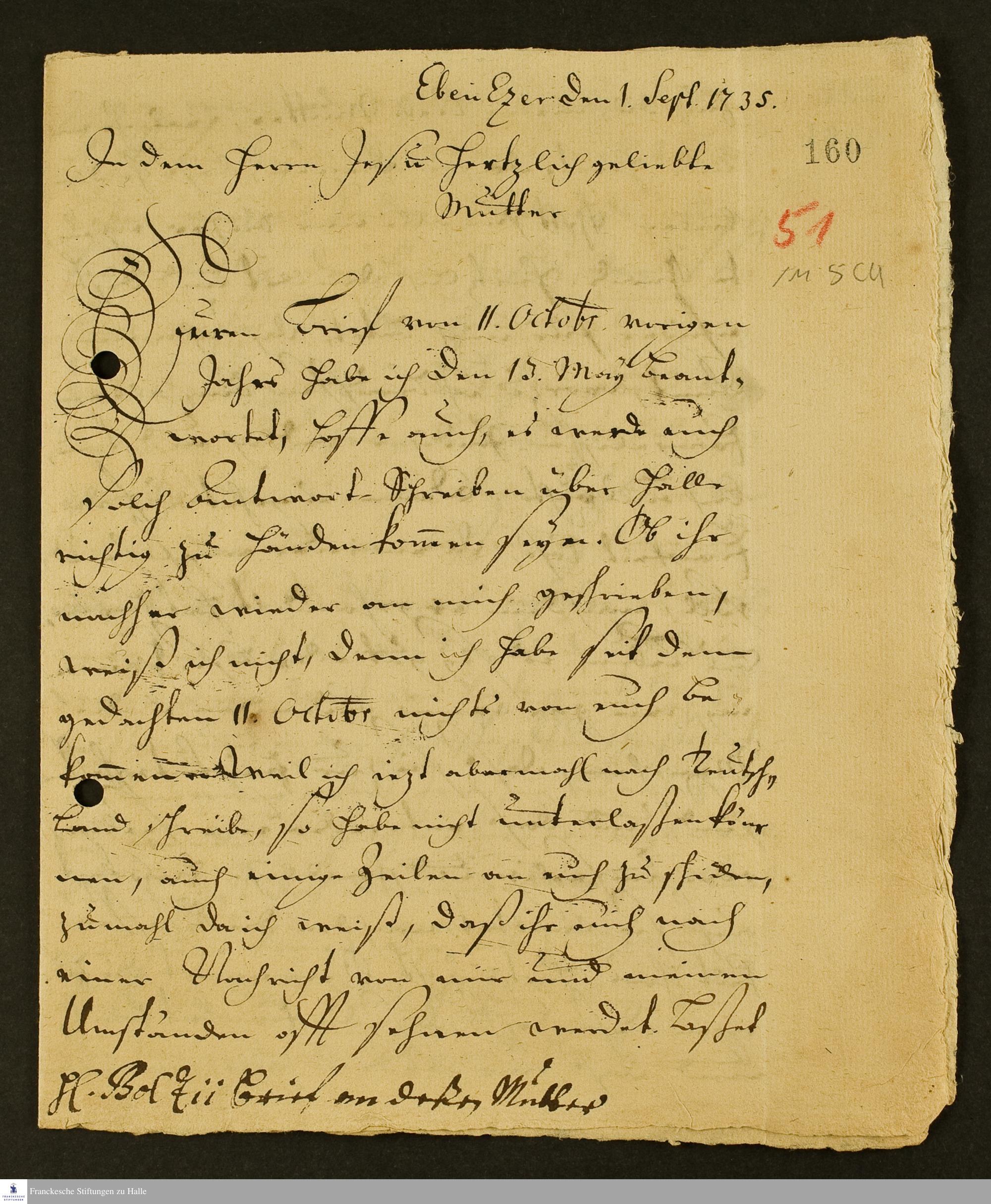Brief von Johann Martin Boltzius an seine Mutter Eva Rosina über seine Heirat.