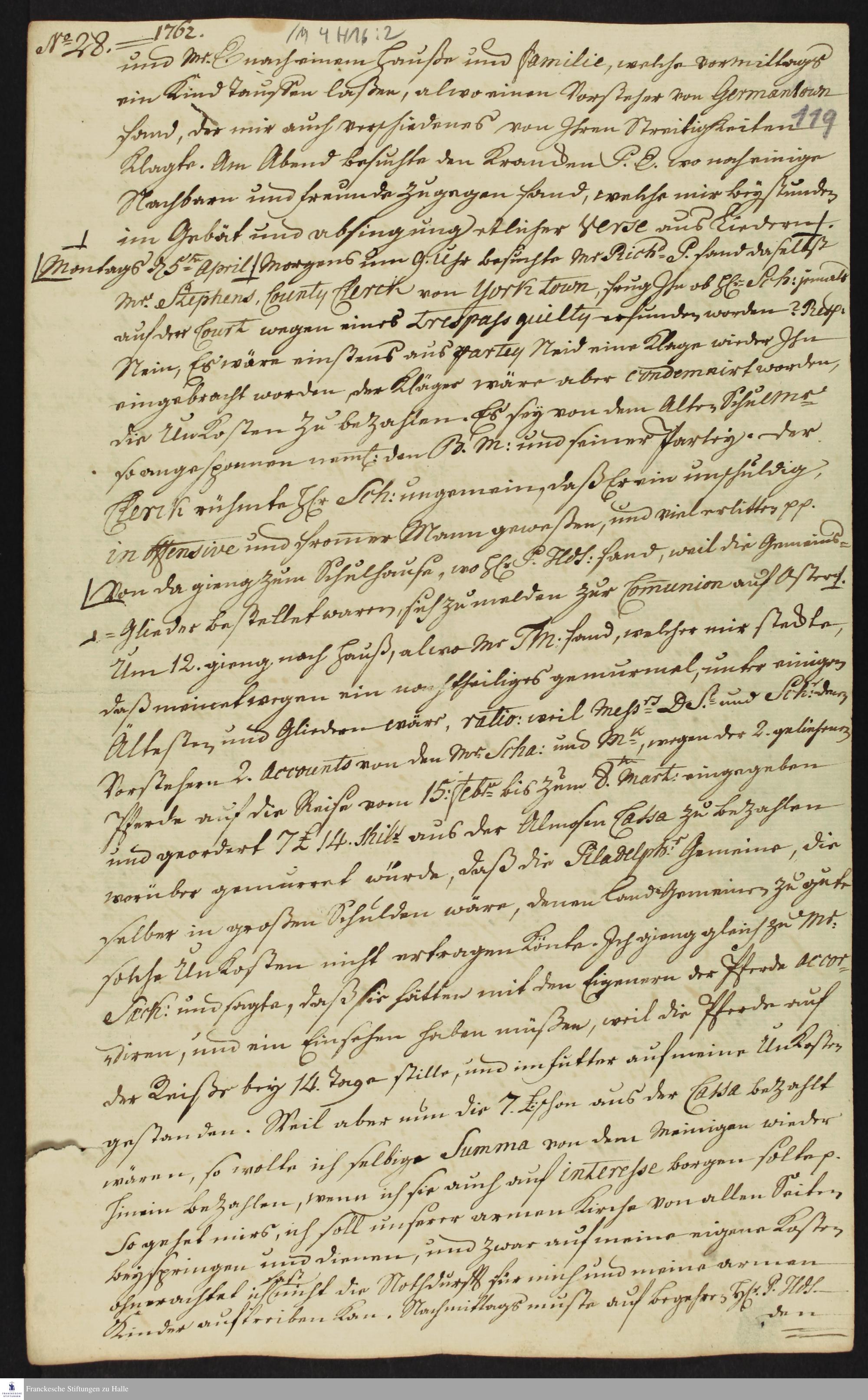 Auszug aus dem Tagebuch von Heinrich Melchior Mühlenberg.