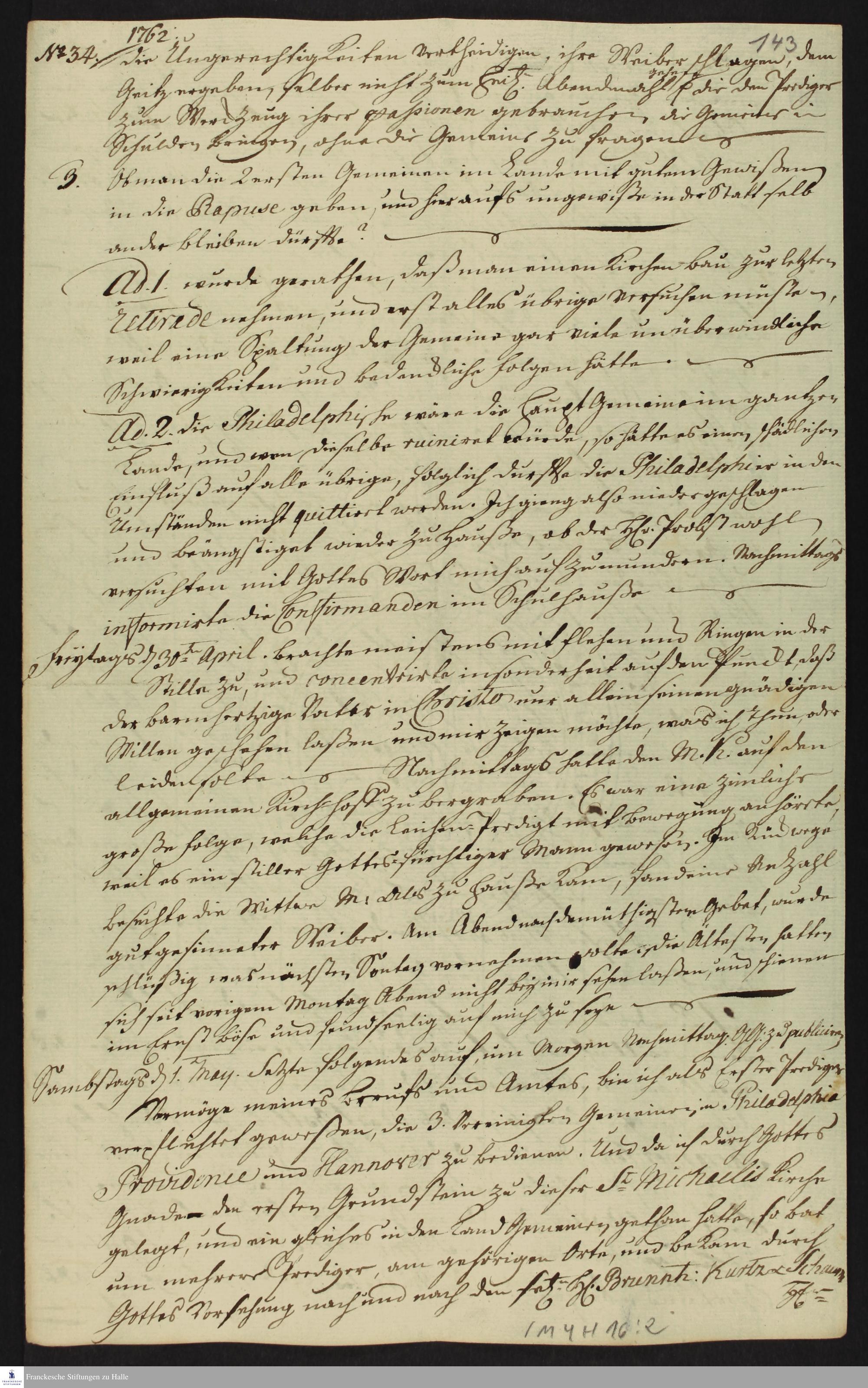 Auszug aus dem Tagebuch von Heinrich Melchior Mühlenberg.