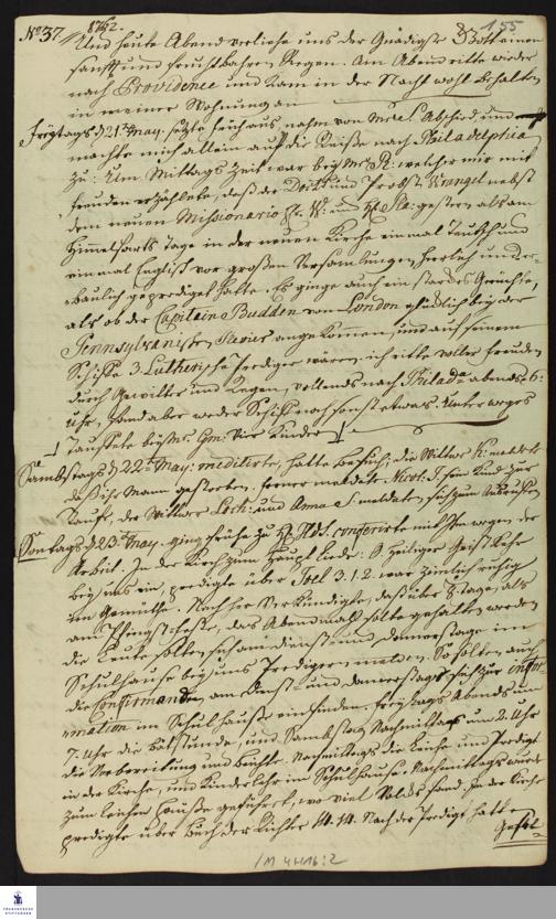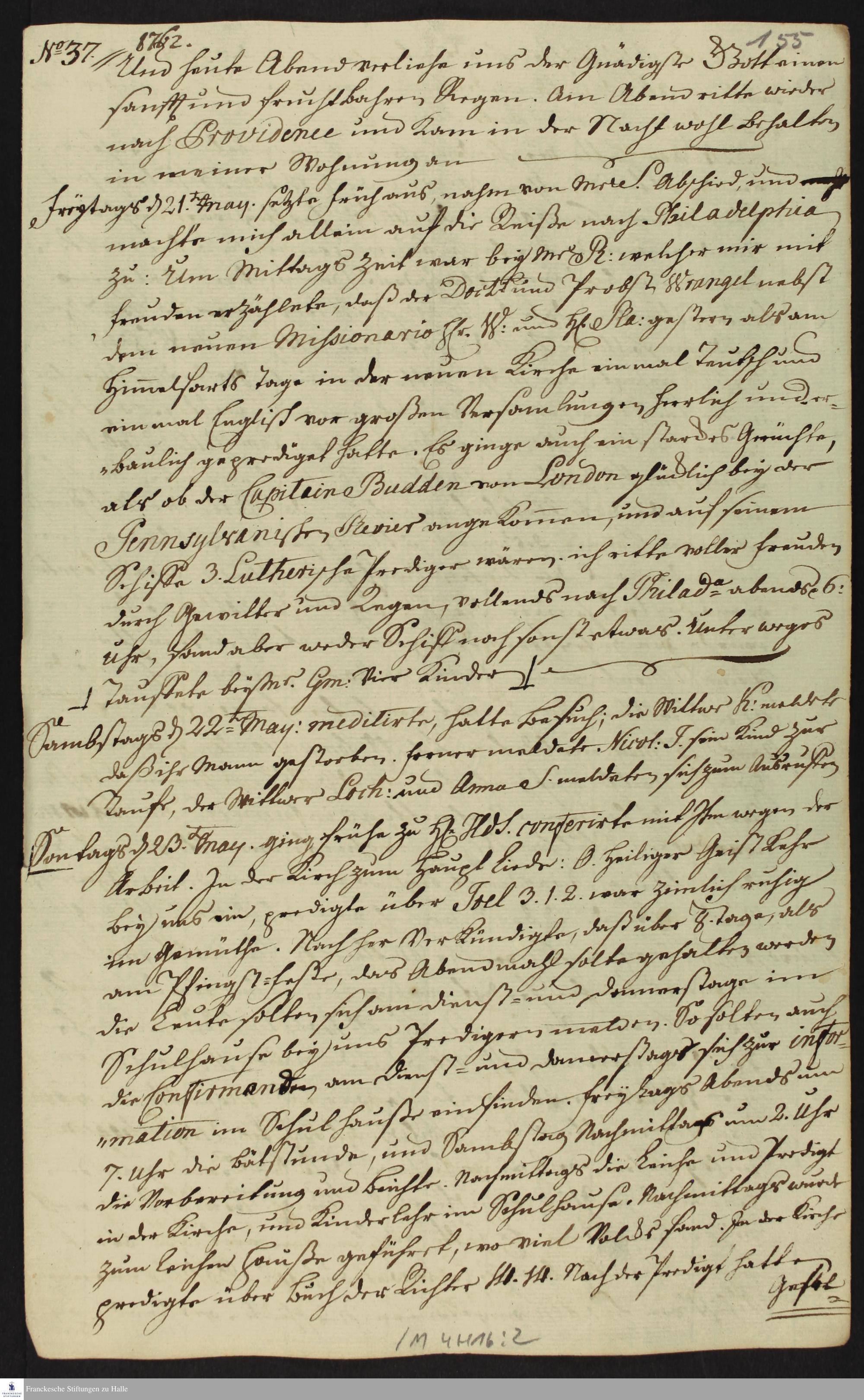 Auszug aus dem Tagebuch von Heinrich Melchior Mühlenberg.