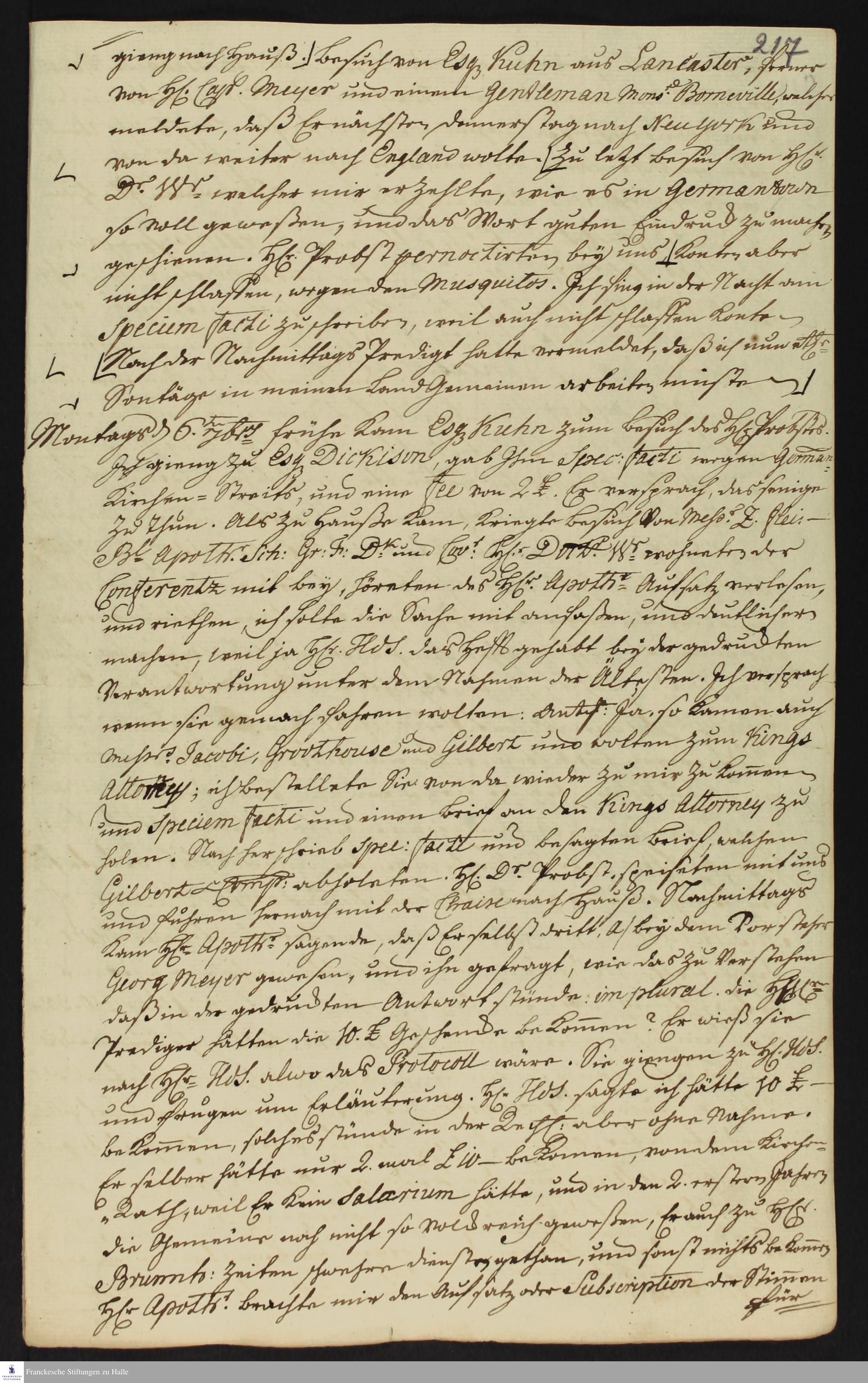 Auszug aus dem Tagebuch von Heinrich Melchior Mühlenberg.