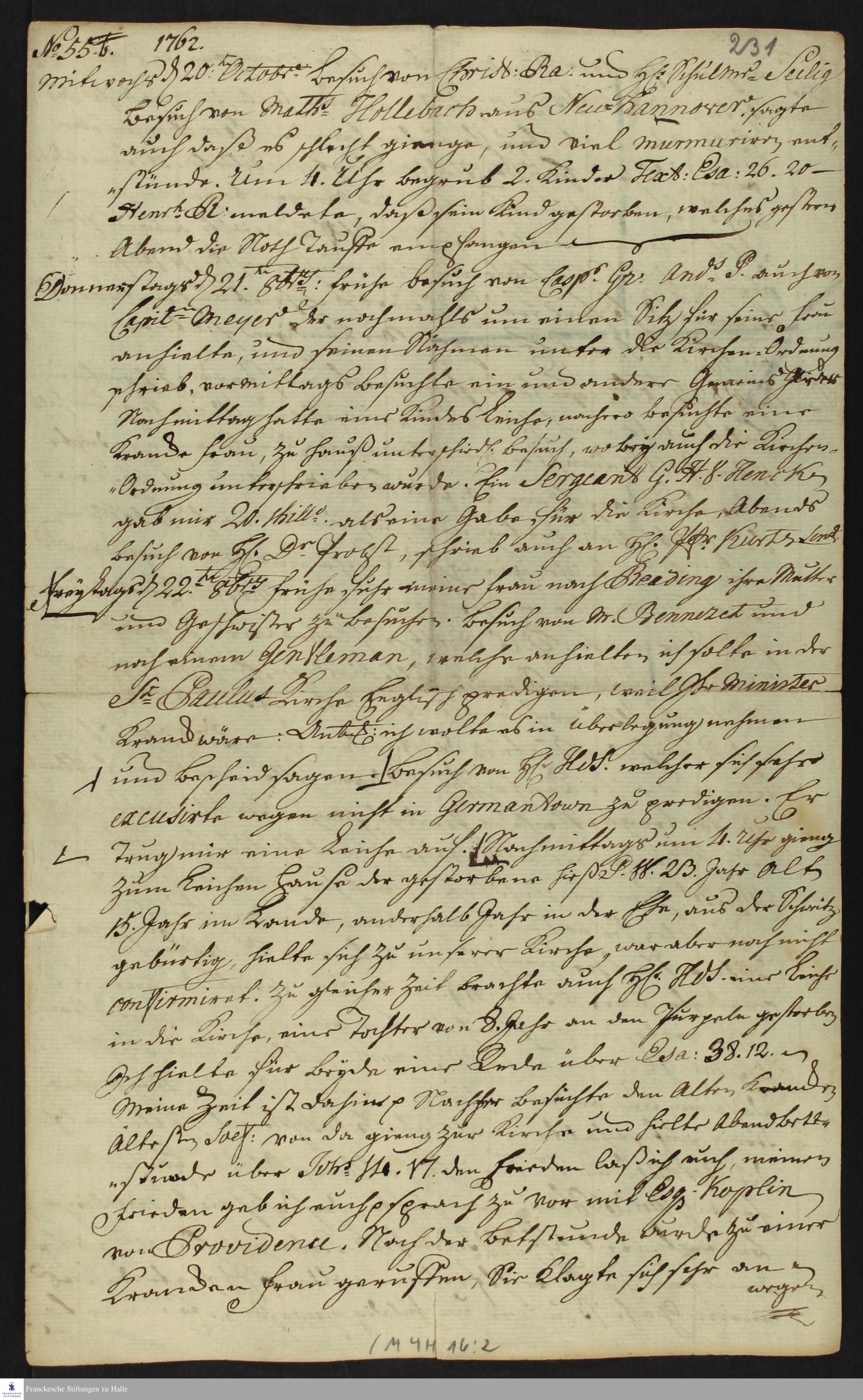 Auszug aus dem Tagebuch von Heinrich Melchior Mühlenberg.
