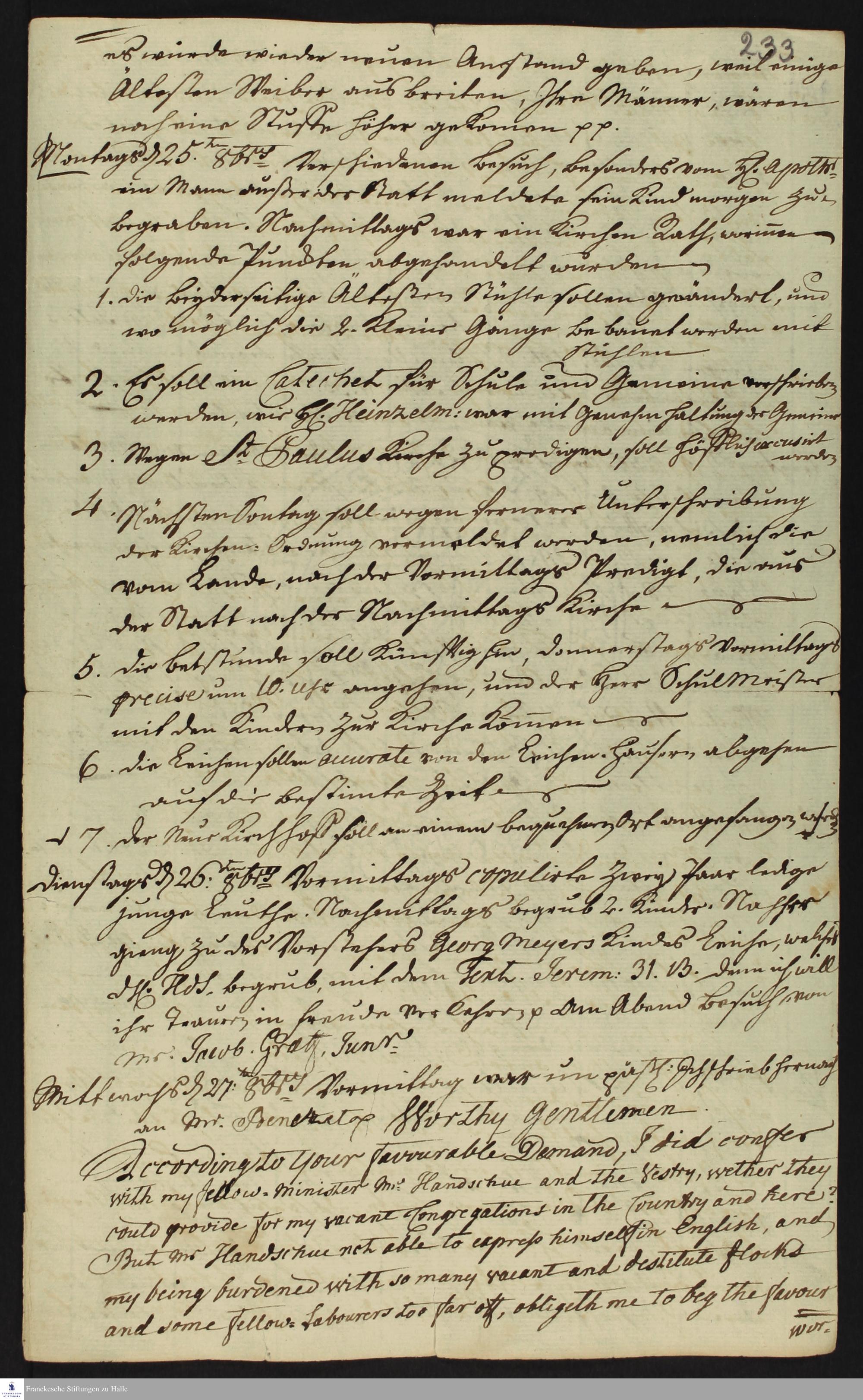 Auszug aus dem Tagebuch von Heinrich Melchior Mühlenberg.