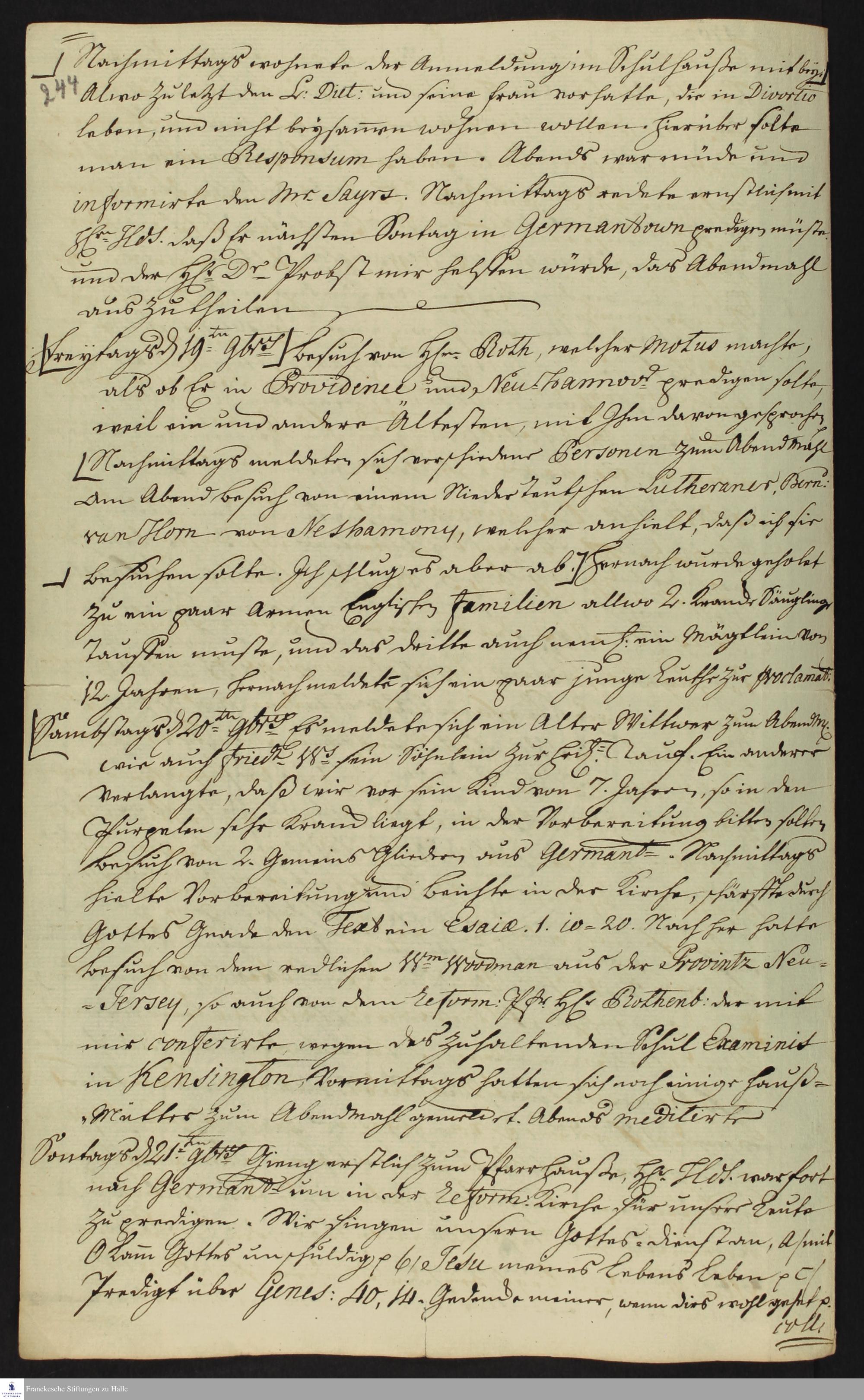 Auszug aus dem Tagebuch von Heinrich Melchior Mühlenberg.