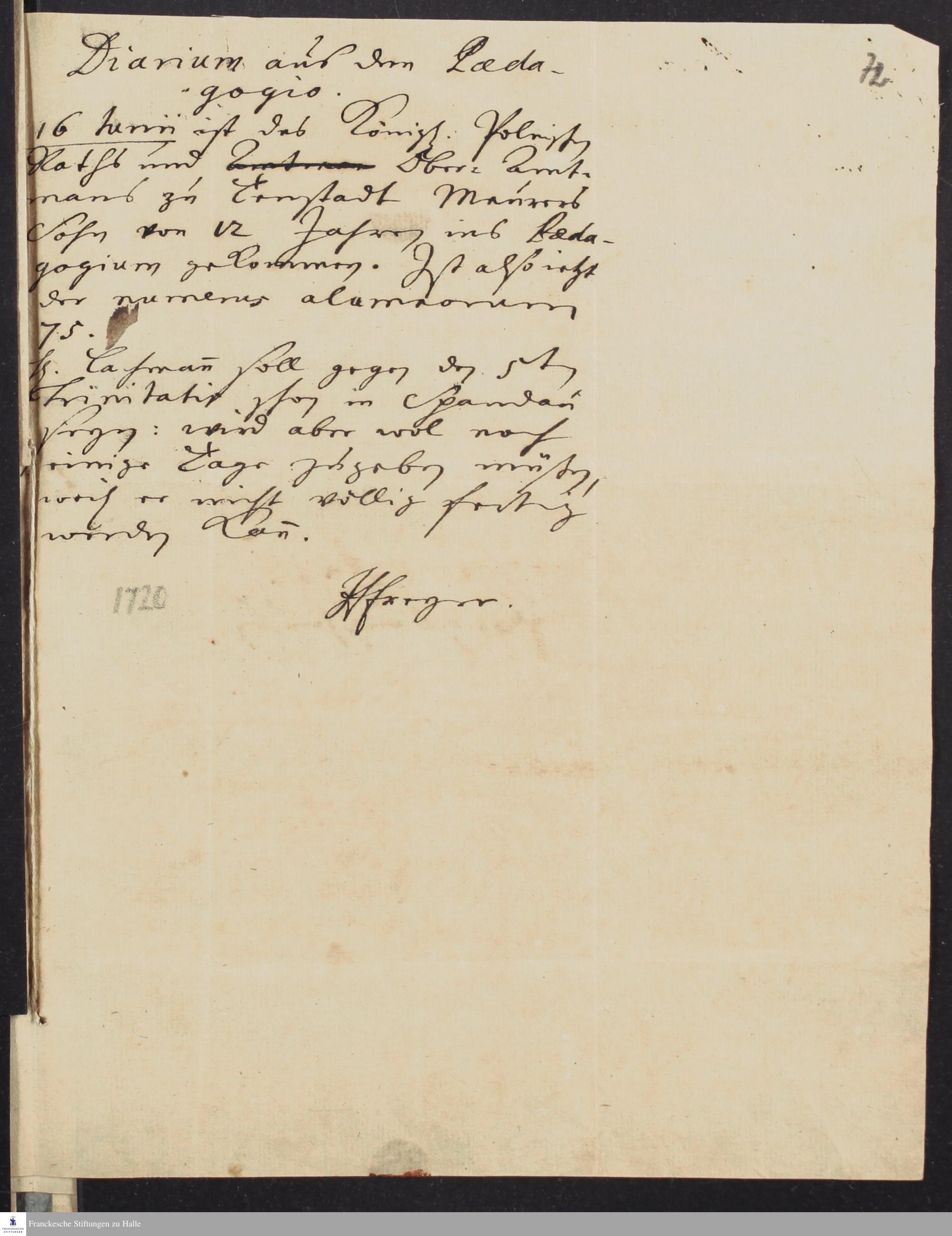 Tagebuch von Hieronymus Freyer an Johann Anastasius Freylinghausen.