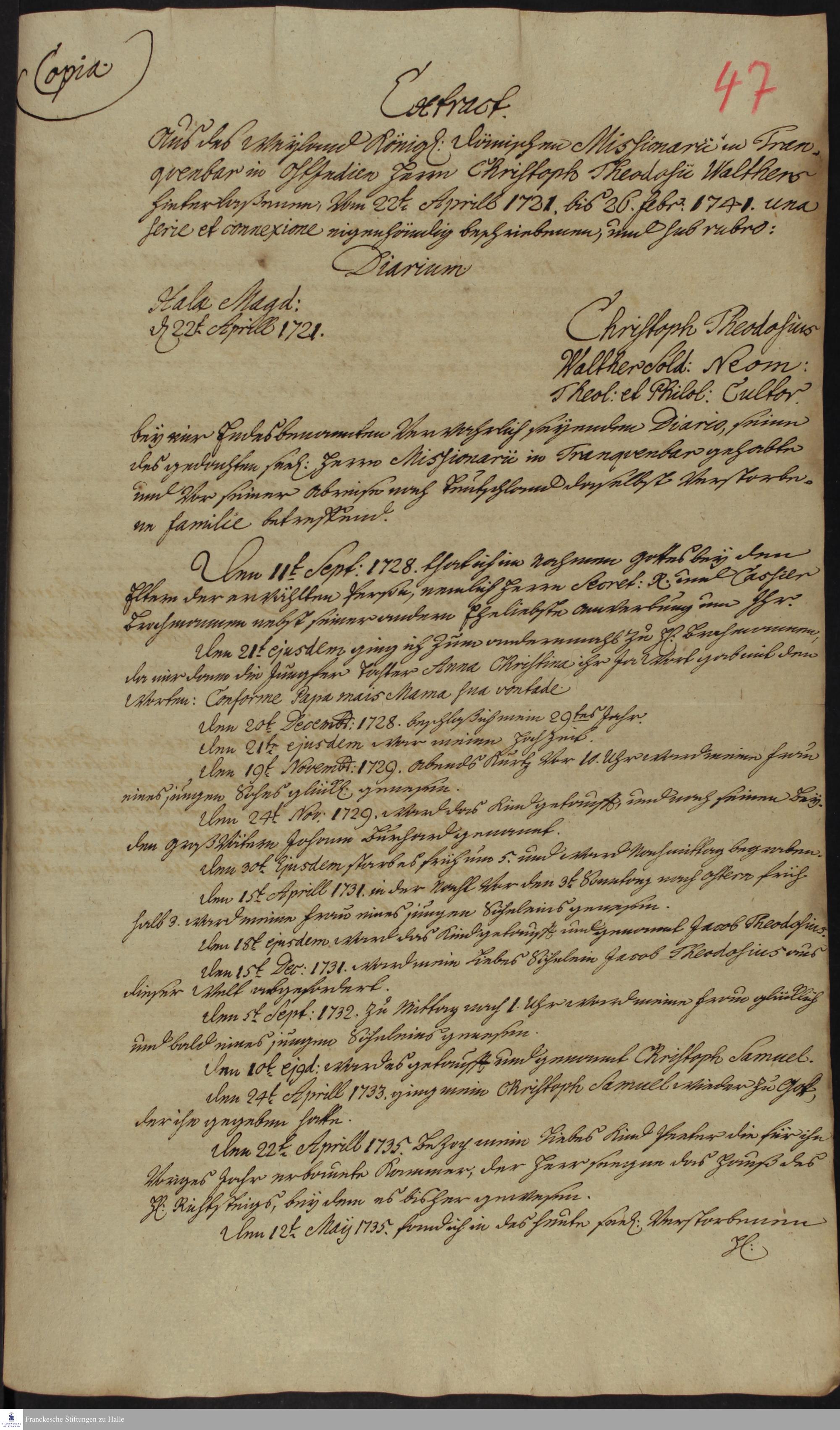 Auszüge aus dem Tagebuch von Christoph Theodosius Walther.