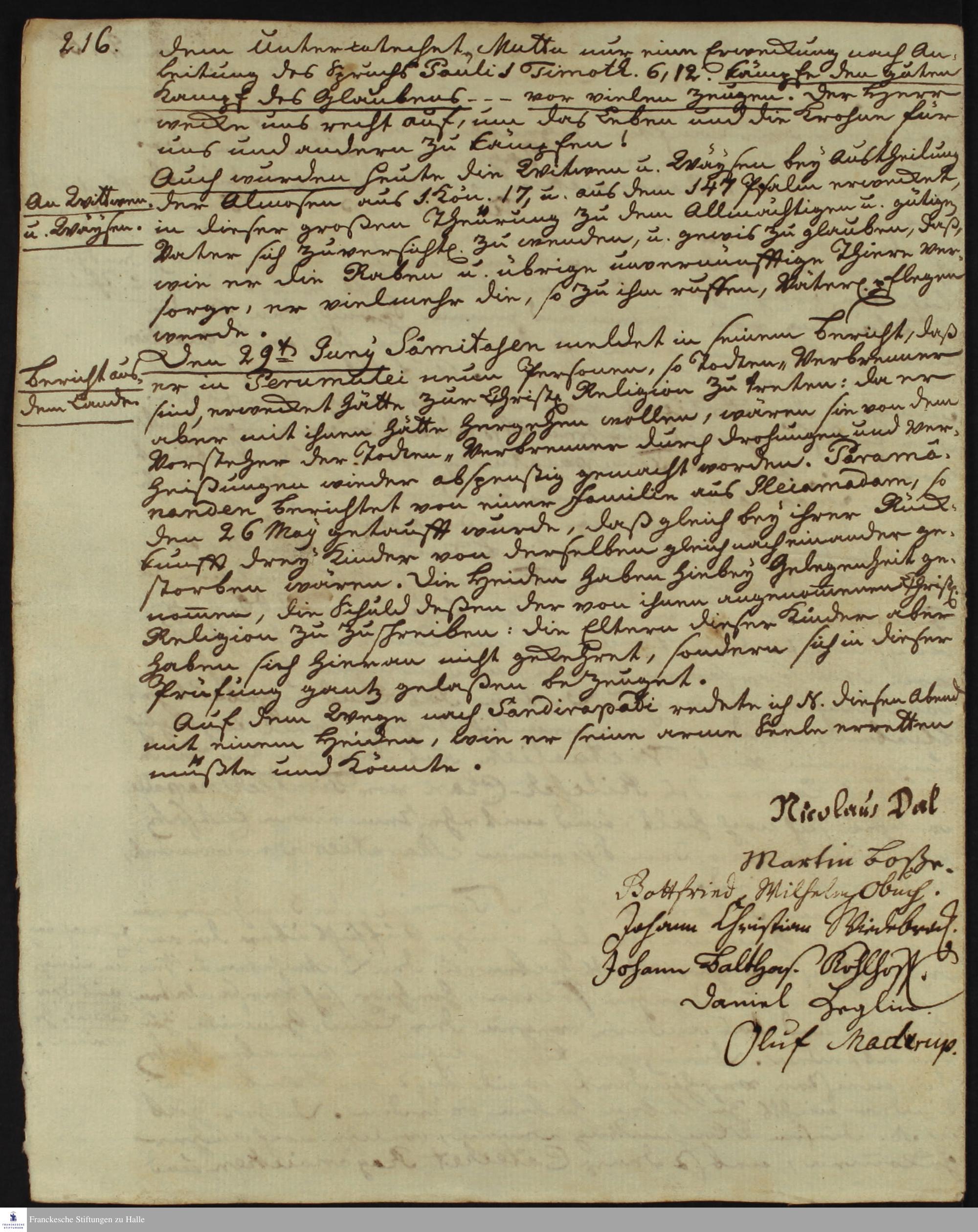 Tagebuch von Nikolaus Dal, Martin Bosse, Gottfried Wilhelm Obuch, Johann Christian Wiedebrock, Johann Balthasar Kohlhoff, Daniel Zeglin und Oluf Maderup.