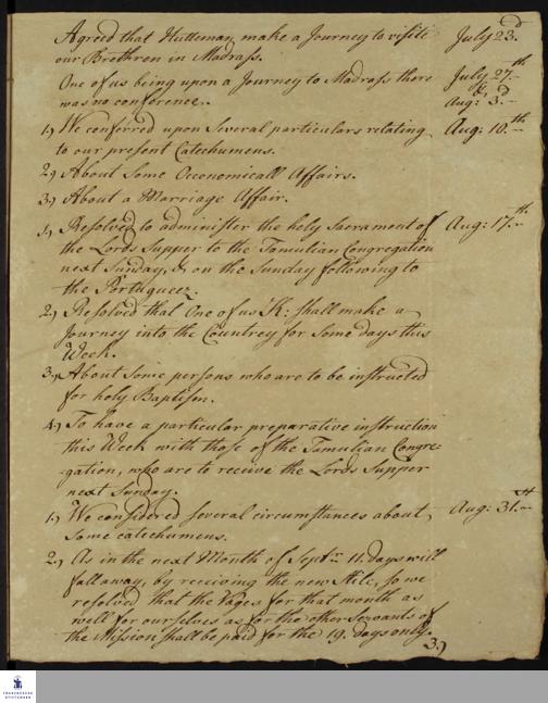Tagebuch von Johann Zacharias Kiernander an Georg Heinrich Conrad Hüttemann.