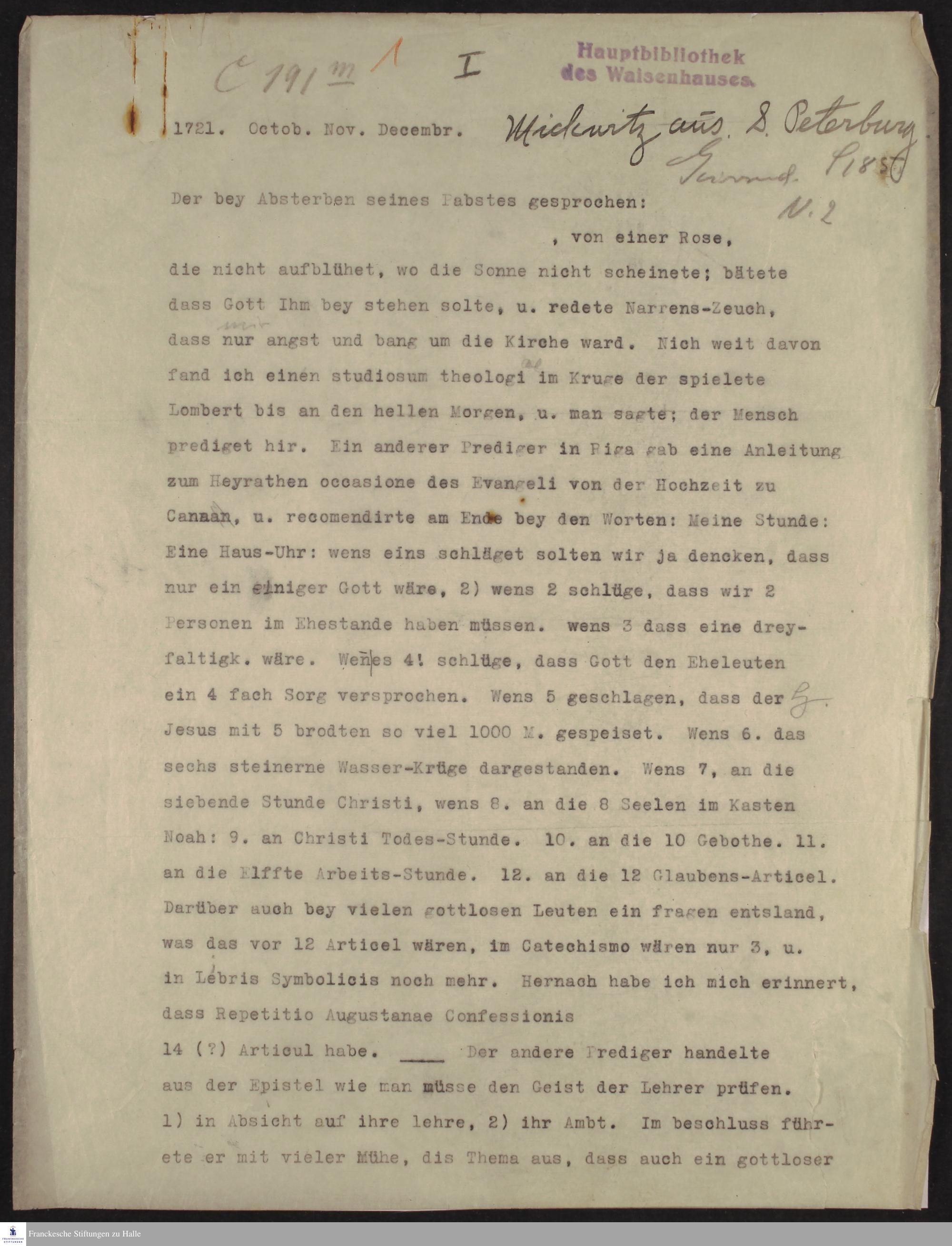 Tagebuchauszüge von Christoph Friedrich Mickwitz.