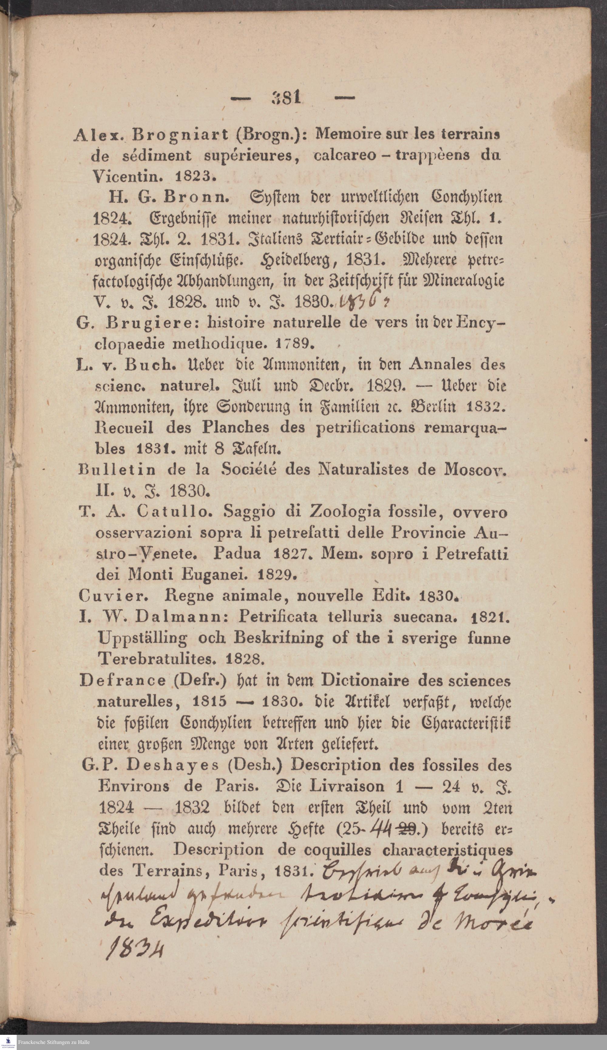 Handschriftliche Anmerkungen und Ergänzungen von Christian Keferstein in einem durchschossenen Exemplar seines Werks "Naturgeschichte des Erdkörpers. Band 2. Zweite Abtheilung. Achter Abschnitt. Die foßilen Mollusken".