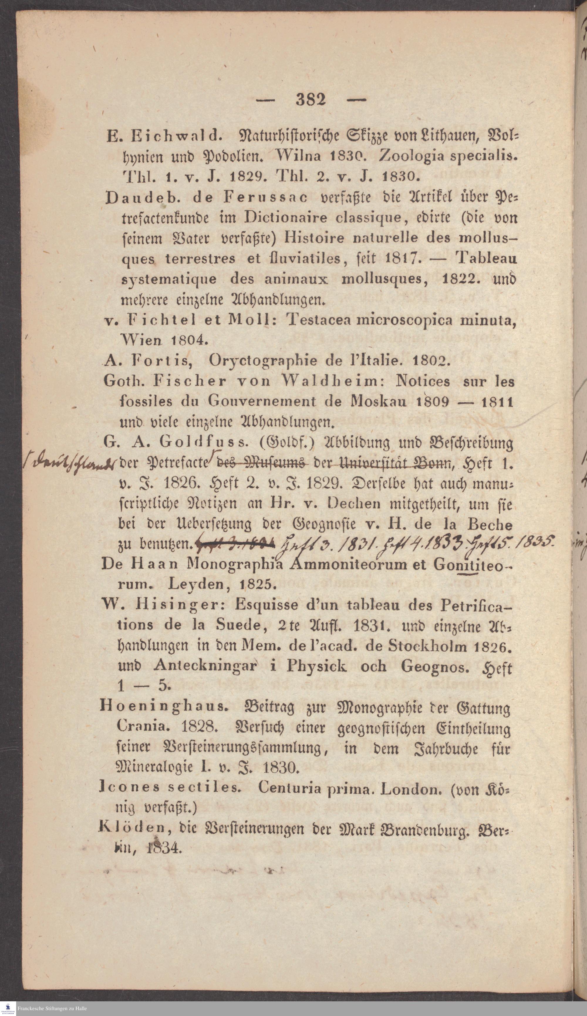 Handschriftliche Anmerkungen und Ergänzungen von Christian Keferstein in einem durchschossenen Exemplar seines Werks "Naturgeschichte des Erdkörpers. Band 2. Zweite Abtheilung. Achter Abschnitt. Die foßilen Mollusken".