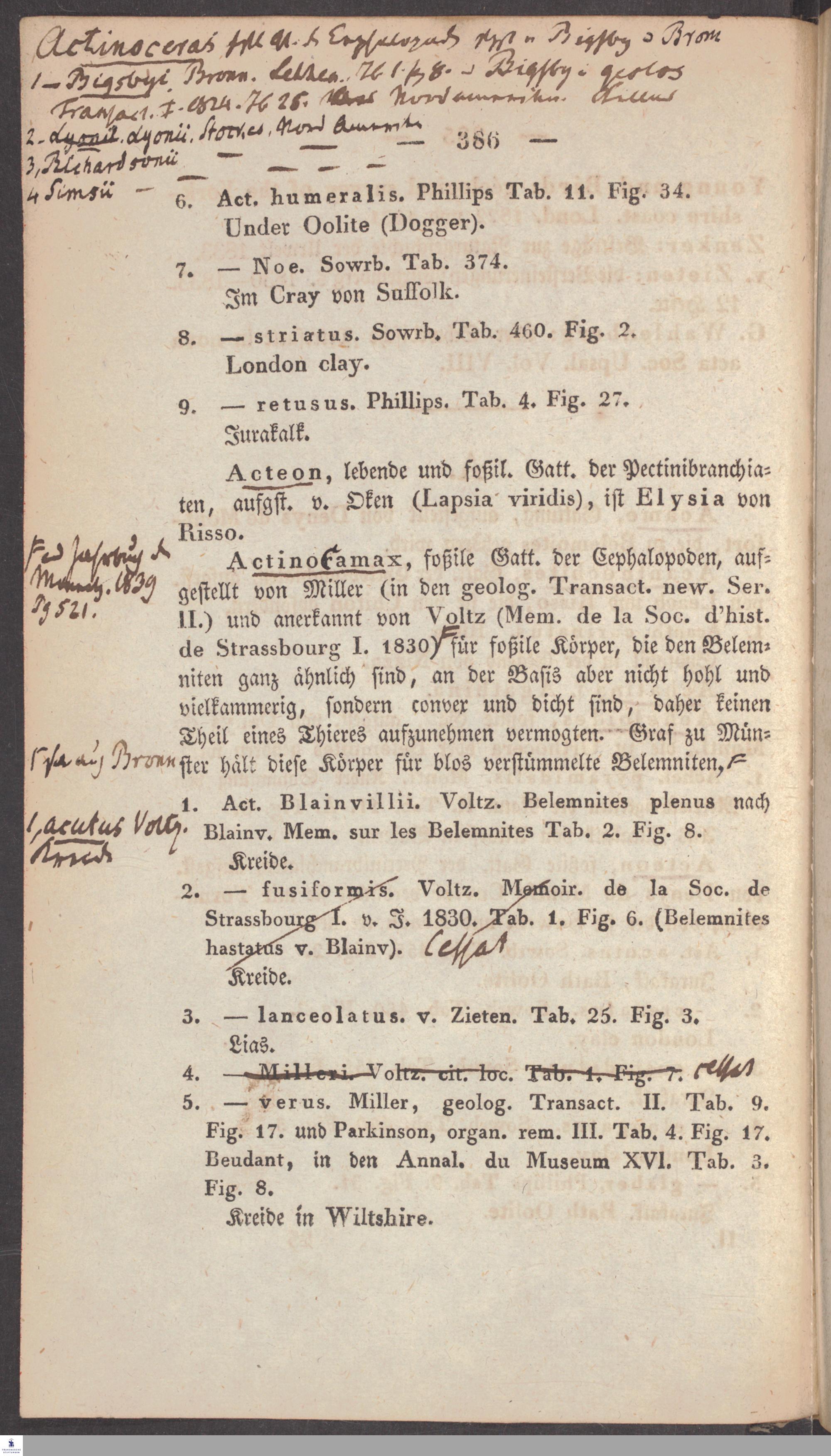 Handschriftliche Anmerkungen und Ergänzungen von Christian Keferstein in einem durchschossenen Exemplar seines Werks "Naturgeschichte des Erdkörpers. Band 2. Zweite Abtheilung. Achter Abschnitt. Die foßilen Mollusken".