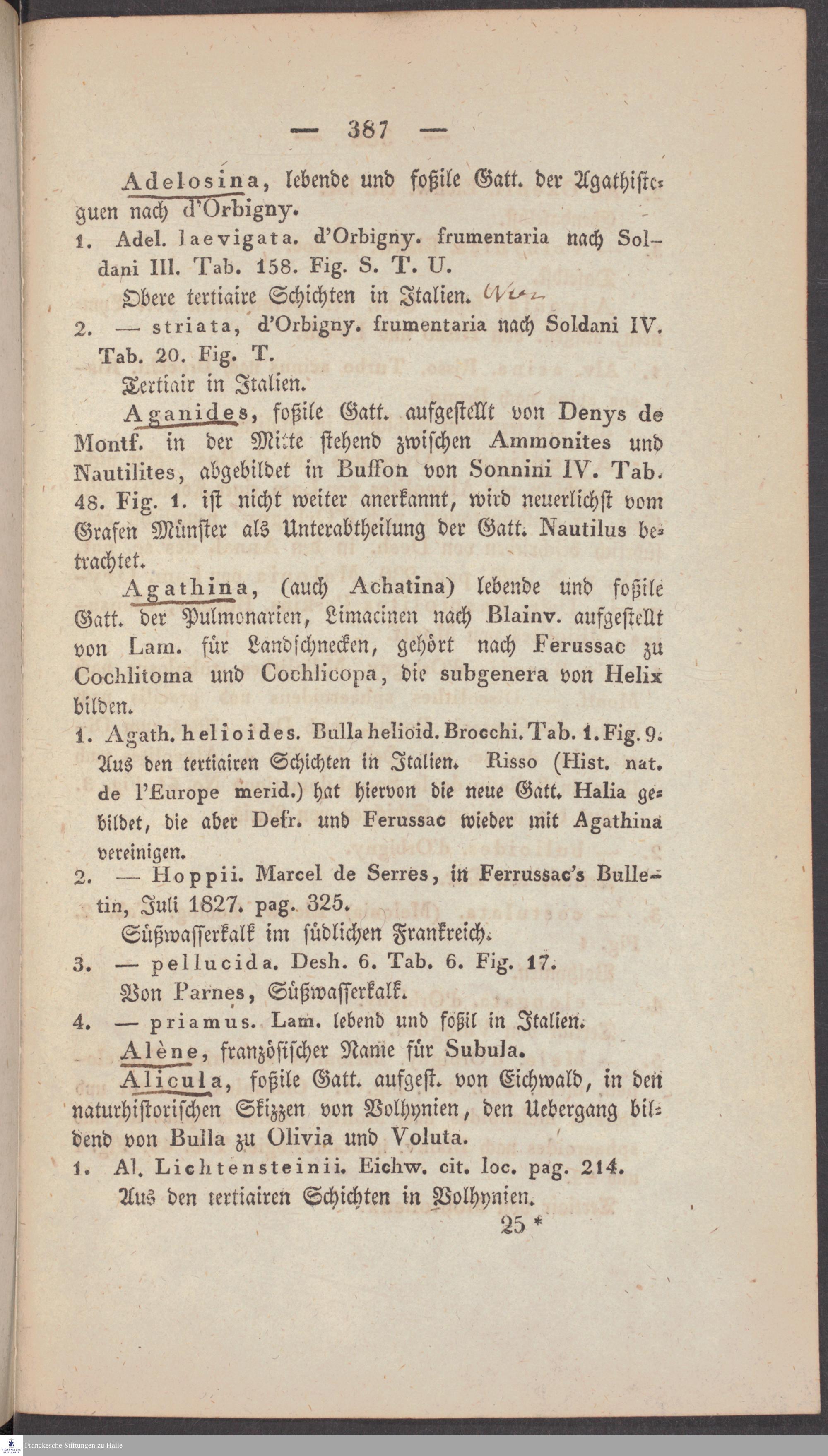 Handschriftliche Anmerkungen und Ergänzungen von Christian Keferstein in einem durchschossenen Exemplar seines Werks "Naturgeschichte des Erdkörpers. Band 2. Zweite Abtheilung. Achter Abschnitt. Die foßilen Mollusken".