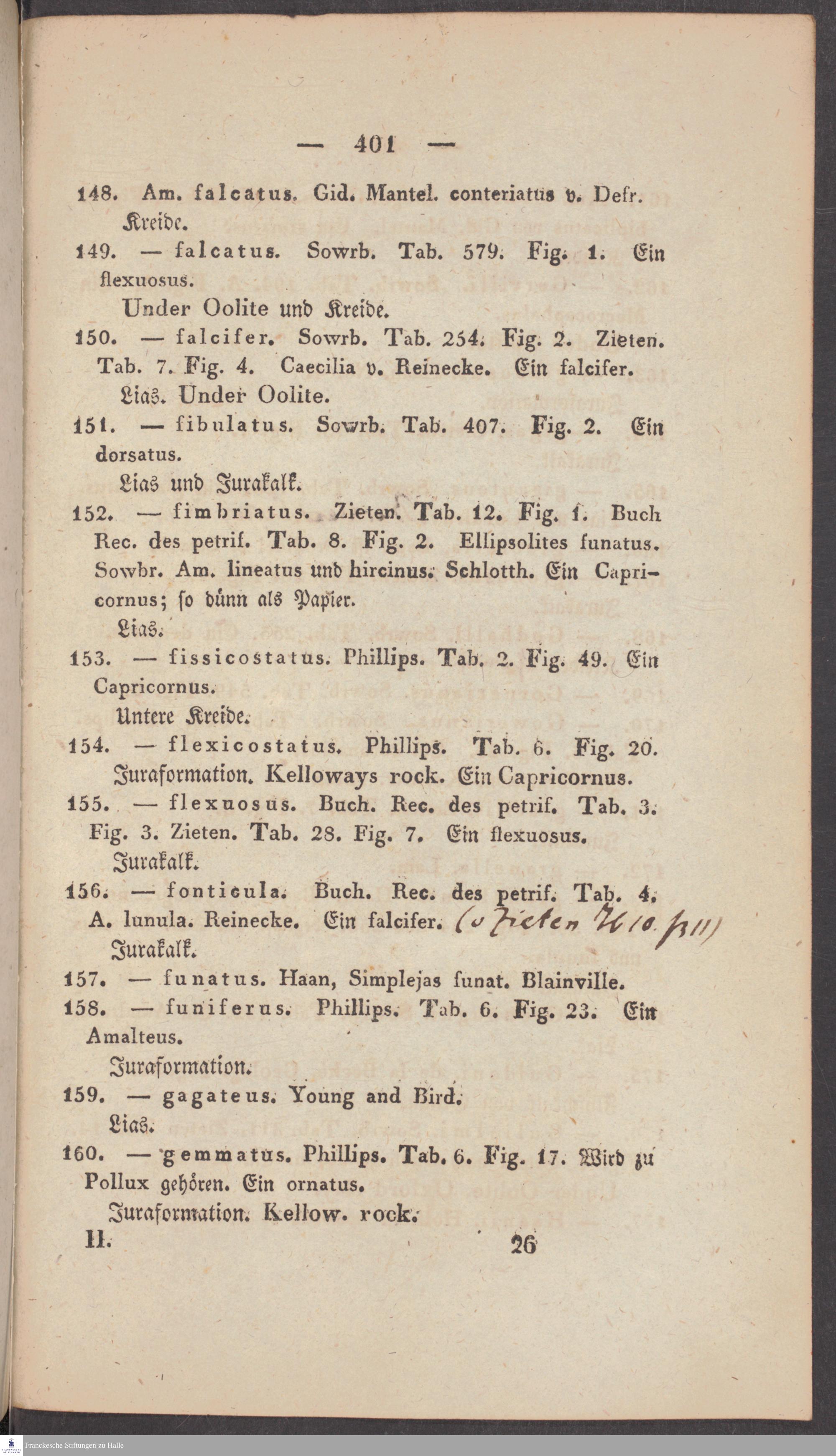Handschriftliche Anmerkungen und Ergänzungen von Christian Keferstein in einem durchschossenen Exemplar seines Werks "Naturgeschichte des Erdkörpers. Band 2. Zweite Abtheilung. Achter Abschnitt. Die foßilen Mollusken".