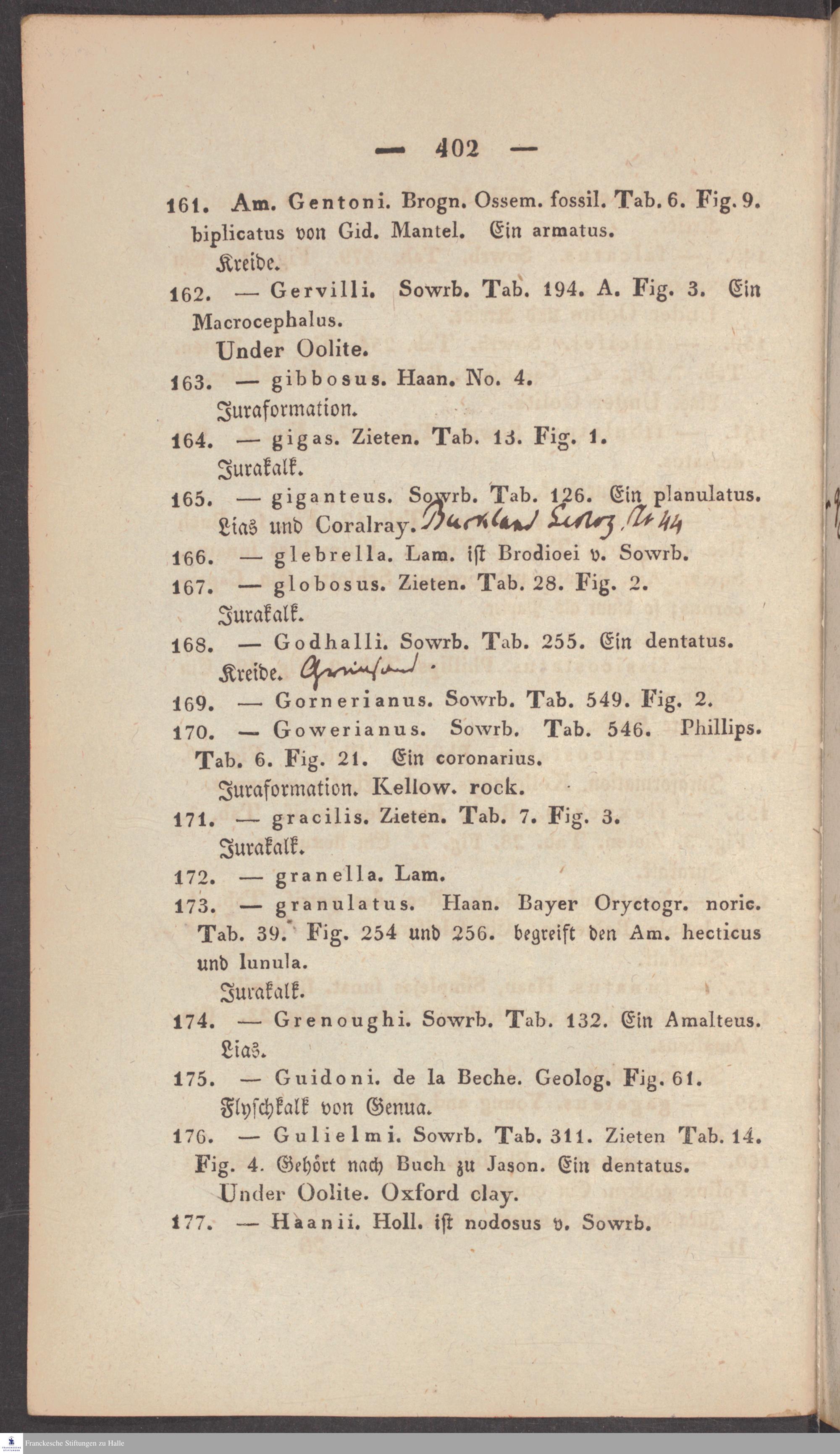 Handschriftliche Anmerkungen und Ergänzungen von Christian Keferstein in einem durchschossenen Exemplar seines Werks "Naturgeschichte des Erdkörpers. Band 2. Zweite Abtheilung. Achter Abschnitt. Die foßilen Mollusken".
